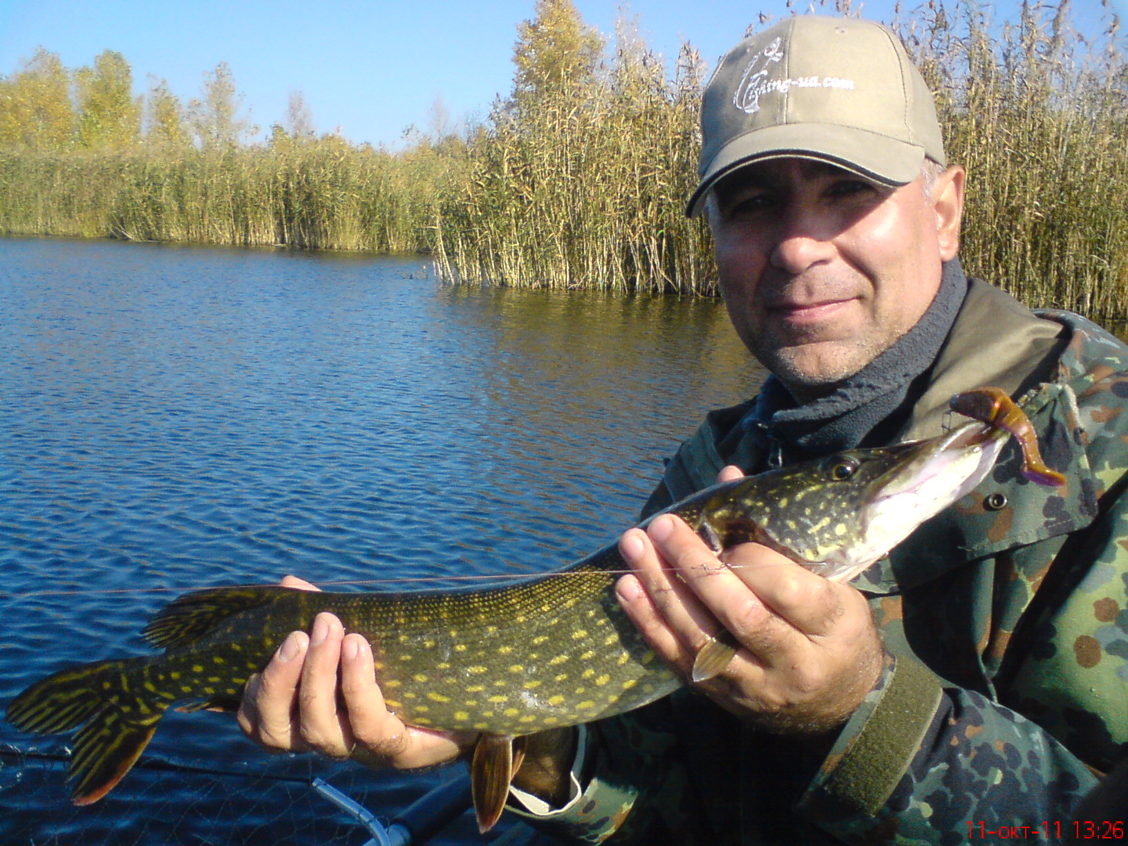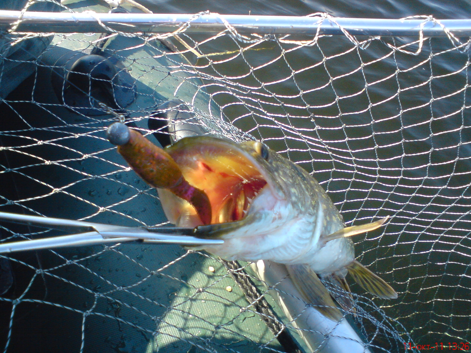 Не буду точно утверждать чем этот силикон больше понравился рыбе - своей плавучестью или цветом, но во время одной из проводок я отвлёкся разговором с напарником и остановил проводку примерно секунд на десять, не меньше, и во время этой паузы получил щучью поклёвку. Как я себе представляю, во время паузы приманка торчала к верху хвостом и слегка шевелилась под действием слабого течения, что наверное и привлекло рыбу.