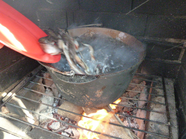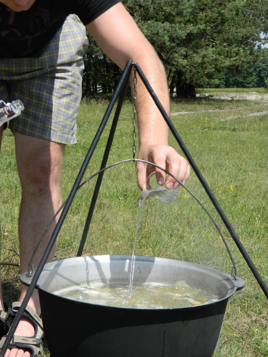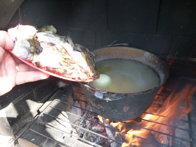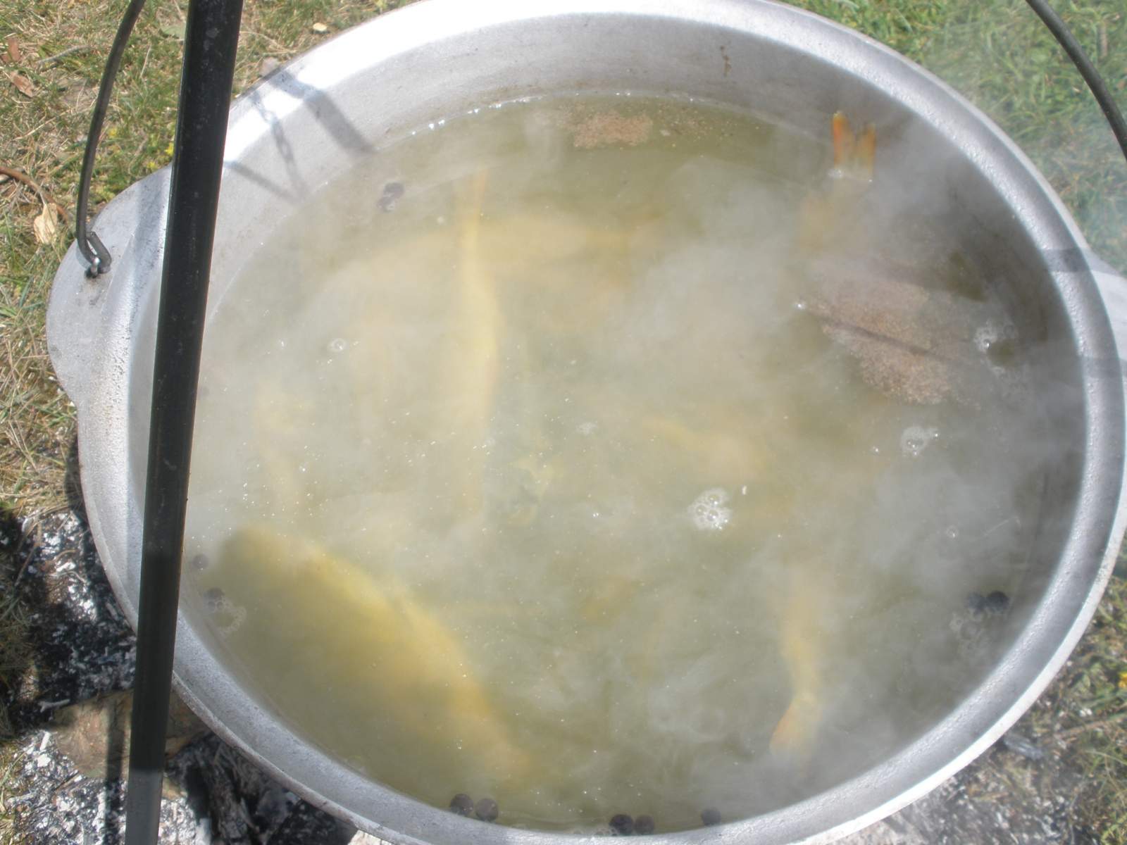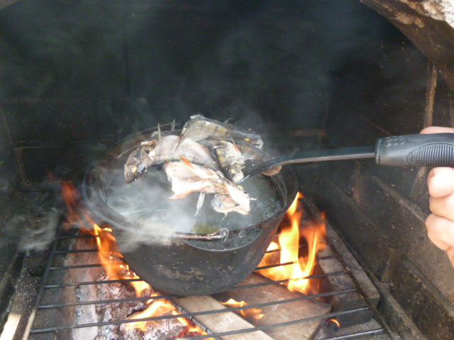 ФОТО 6 Туди нарізану кружальцями моркву та дрібно насічуну петрушку ФОТО 7 Коли риба майже готова вливаємо 100 грам горілки ФОТО 8 Фінальний штрих перед подачею до столу - гасим березове поліно ФОТО 9 В кінці після приготування юшки залишився жар, на якому приготували замариновану скумбрію, яка після 15 хвилин проведених над жаром радувала нас своїми золотисто - засмаглими боками.