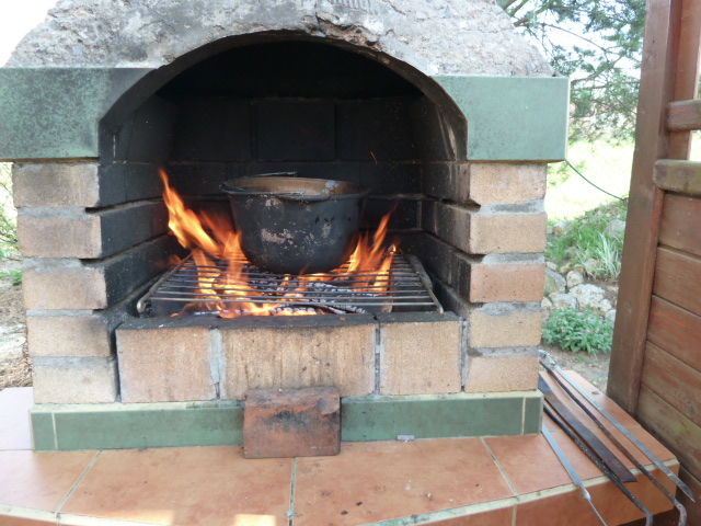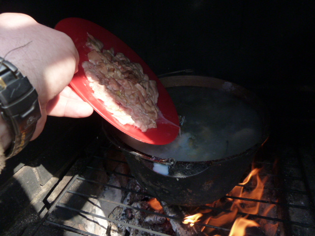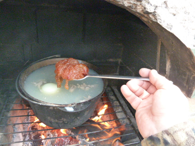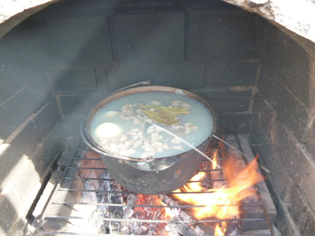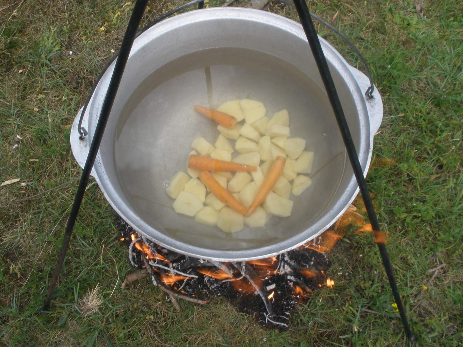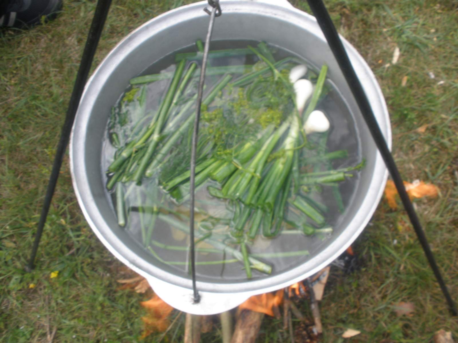 ФОТО 6 Туди нарізану кружальцями моркву та дрібно насічуну петрушку ФОТО 7 Коли риба майже готова вливаємо 100 грам горілки ФОТО 8 Фінальний штрих перед подачею до столу - гасим березове поліно ФОТО 9 В кінці після приготування юшки залишився жар, на якому приготували замариновану скумбрію, яка після 15 хвилин проведених над жаром радувала нас своїми золотисто - засмаглими боками.