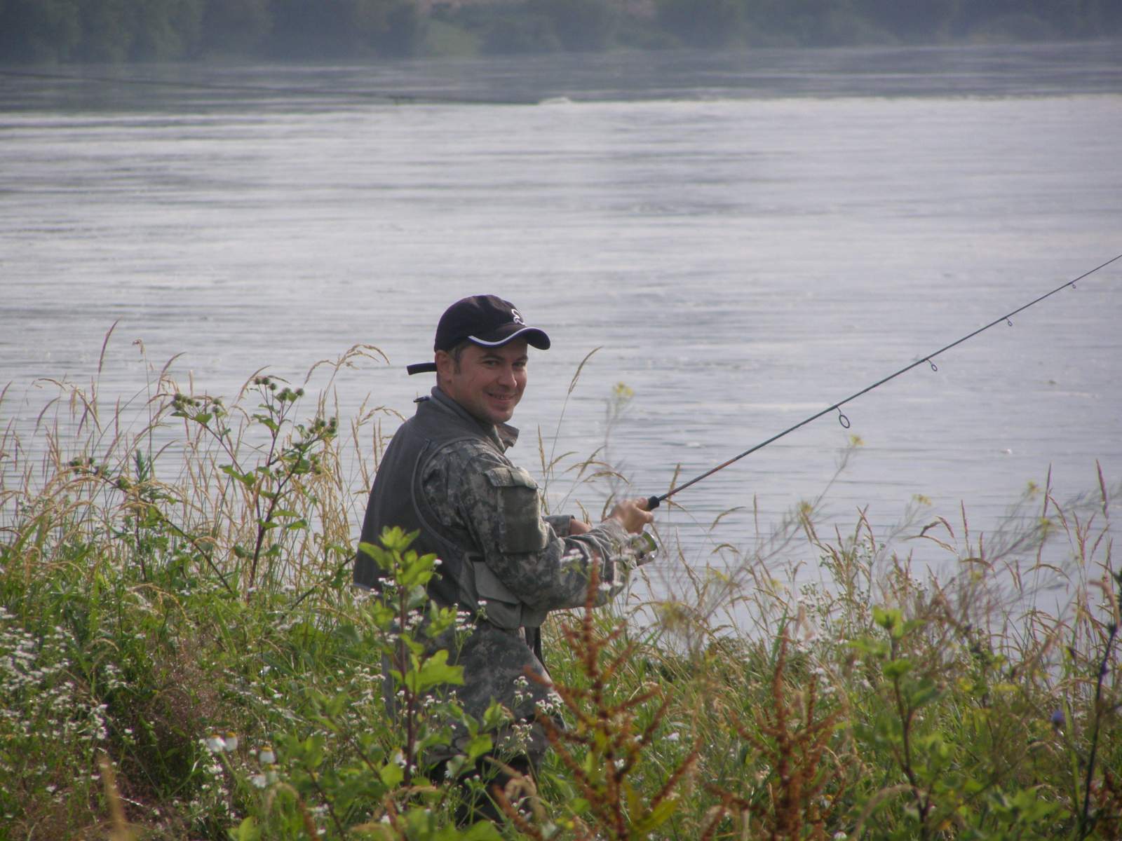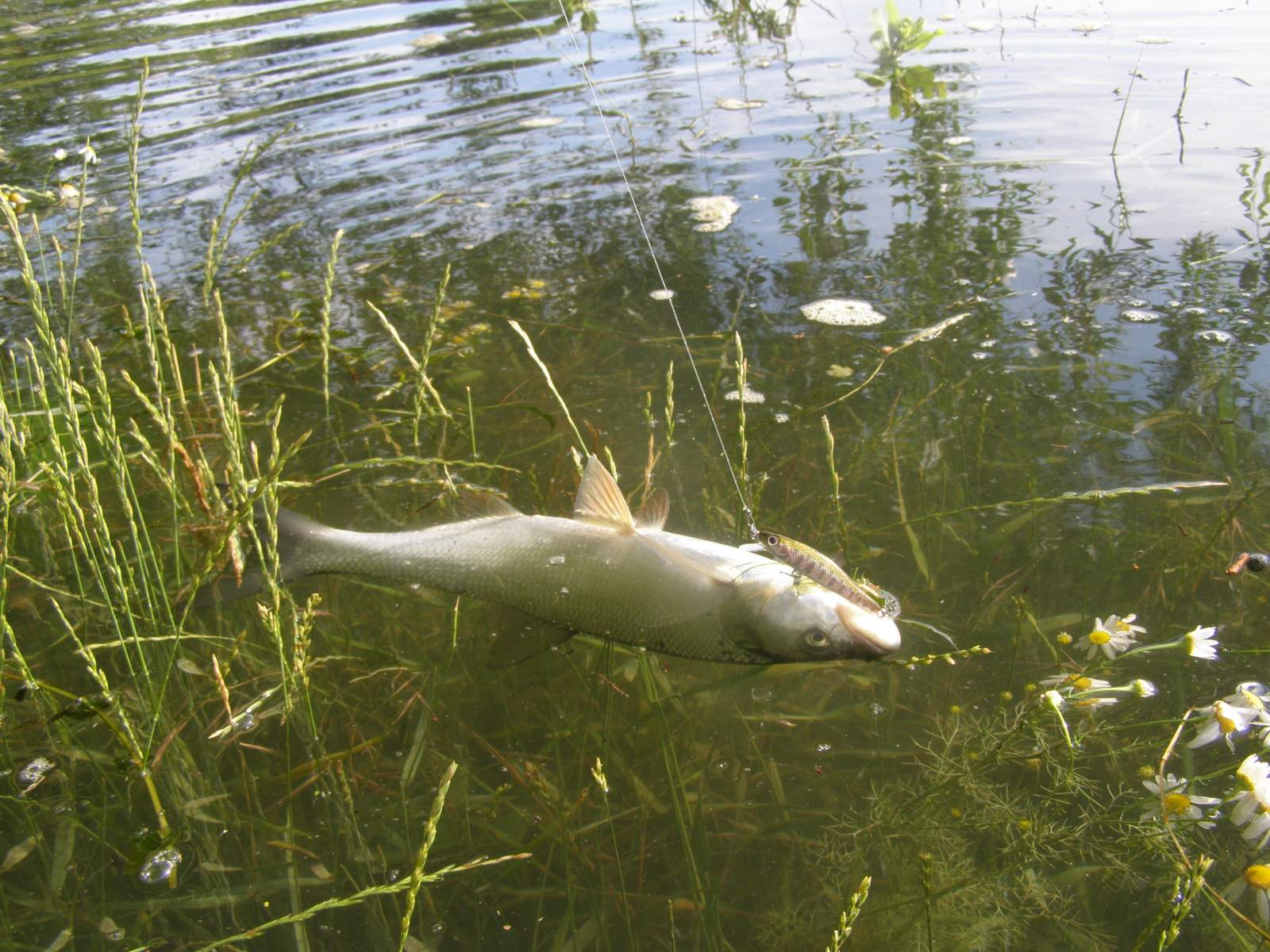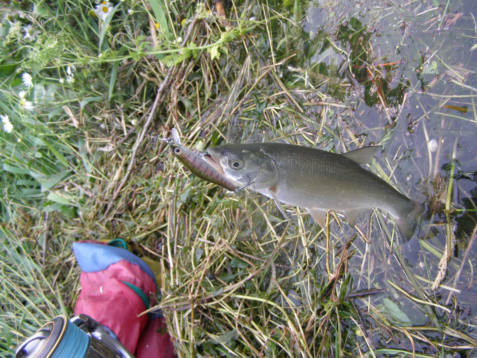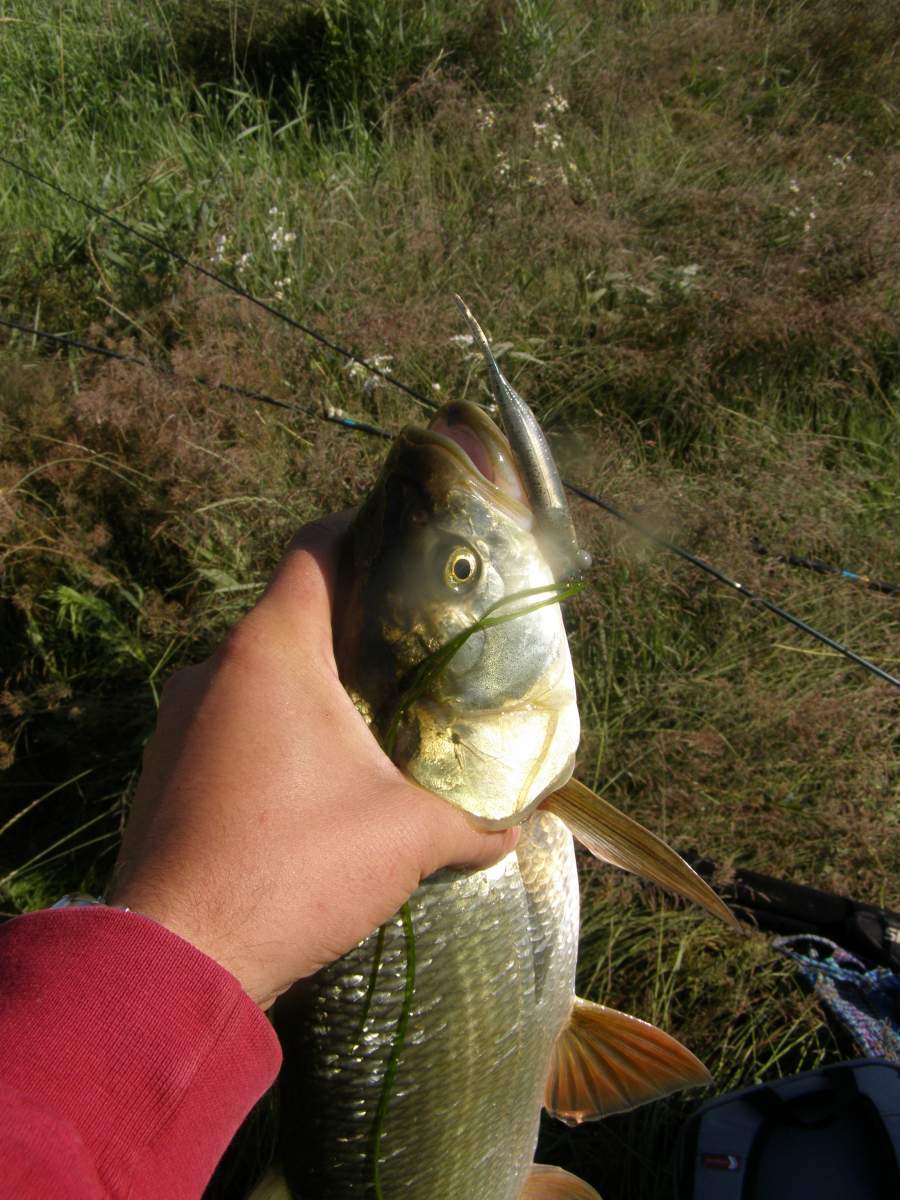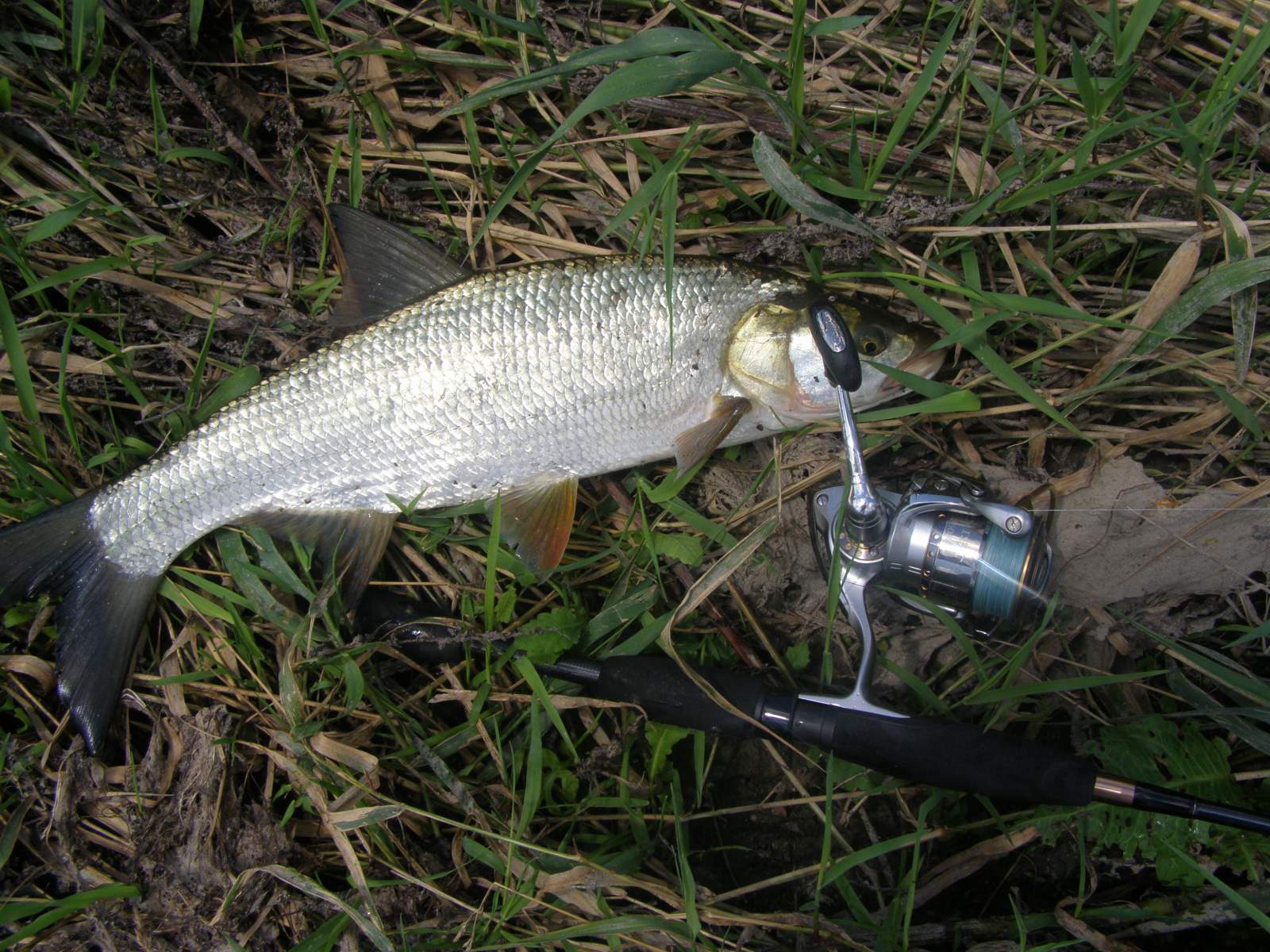Получилось у меня еще раз вырваться на мою любимую речку на 4 дня:).Вода уже спала немного, но еще не стала в свое русло.Жерех как обычно присутствовал во многих местах хотя и не с такой интенсивностью как в первых числах.Было решено упираться в него.На первом разведывательном месте были единичные выходы шереспера не малых размеров, но увы отзываться на искусственные приманки он отказался.Зато я соблазнил на воблерок голавлишку грам на 400.Потом поставил МКджиг.Поймал парочку окуней и на очередной проводке что то посерьезней село. Через несколько секунд, на мое удивление, из воды показался подлещик до пол кила. После такой поимки было решено на следующее утро приехать половить на поплавчанку. После подлеща решили ехать домой, но по пути заскочить еще на одно жереховое место.Отцу сказал ждать на берегу пока я не проверю место на наличие жереха.Делаю первые 10 забросов и вот оно, первый жерешок под кило на берегу.Кричу отцу, чтоб разматывался тоже.Пока он разматывался я еще одного поймал и потом тишина-отец зря размотался.
