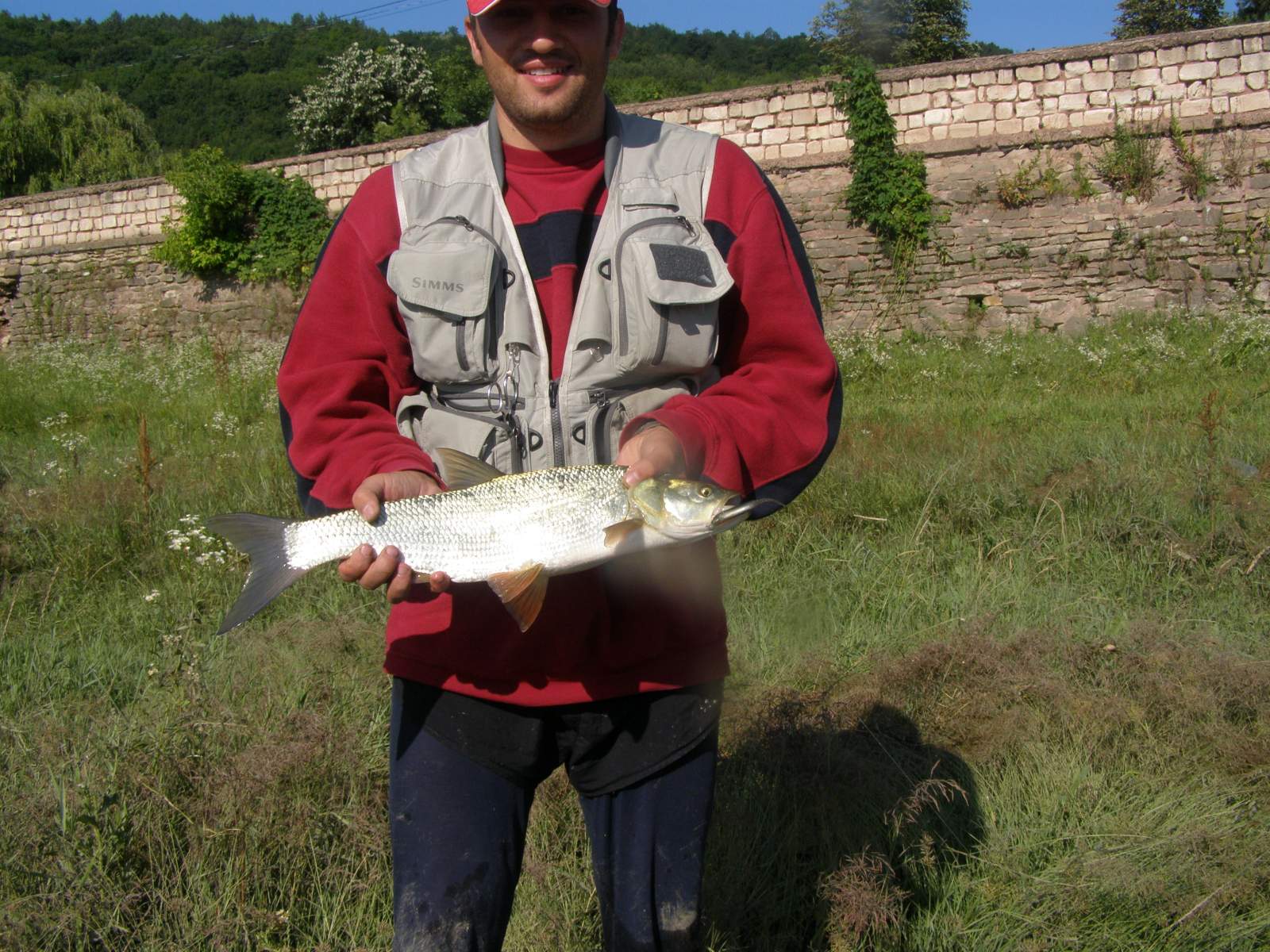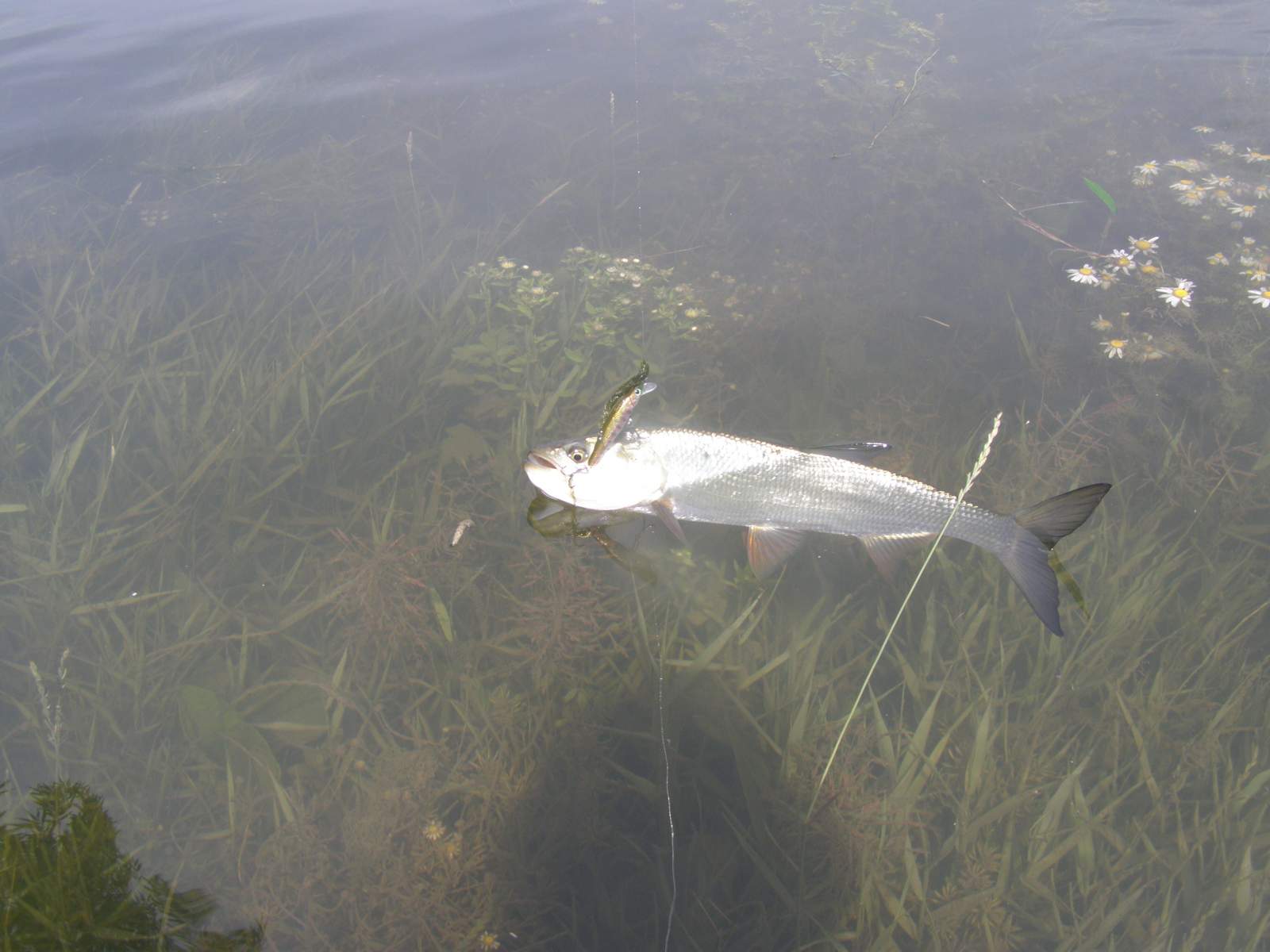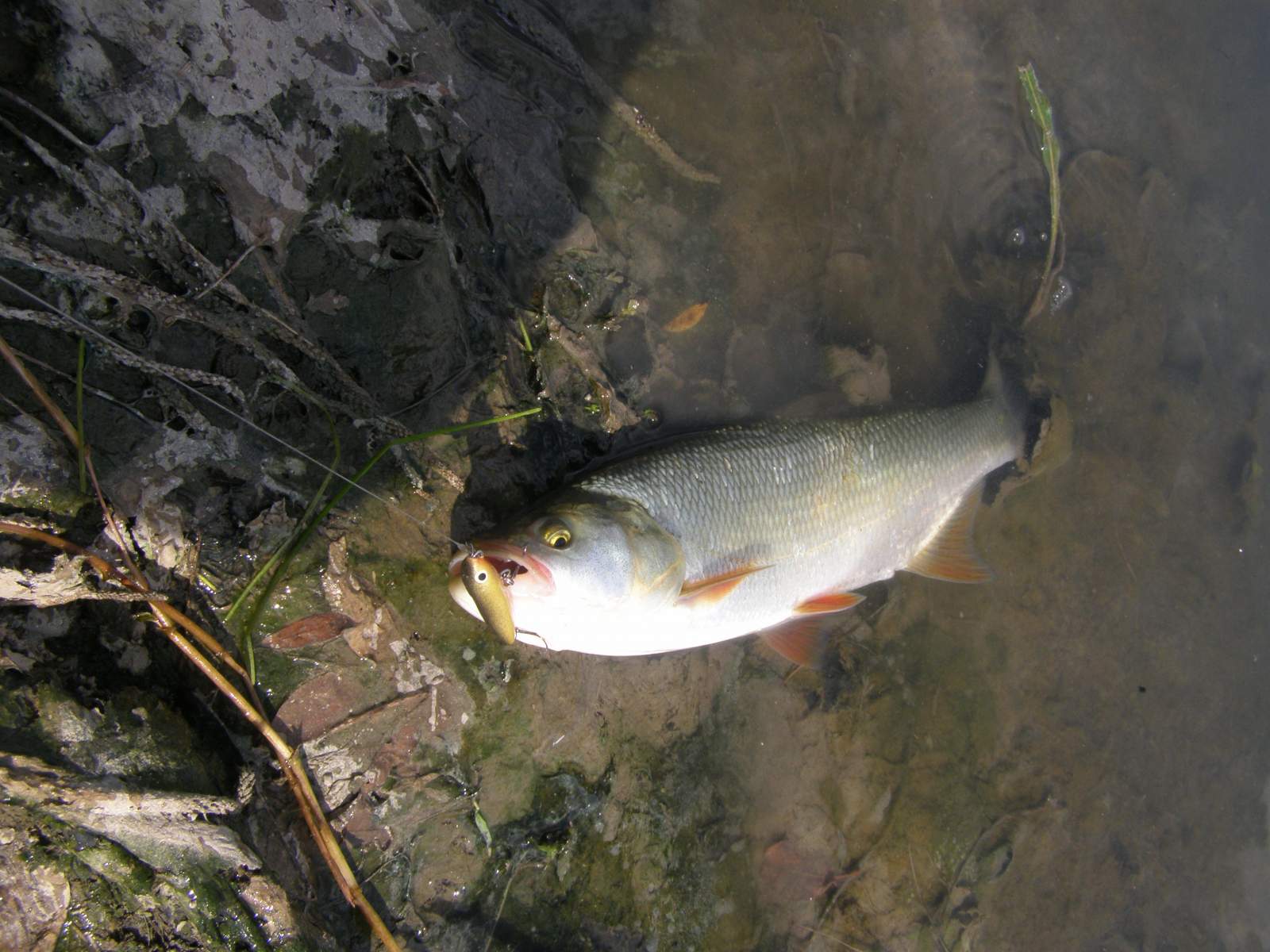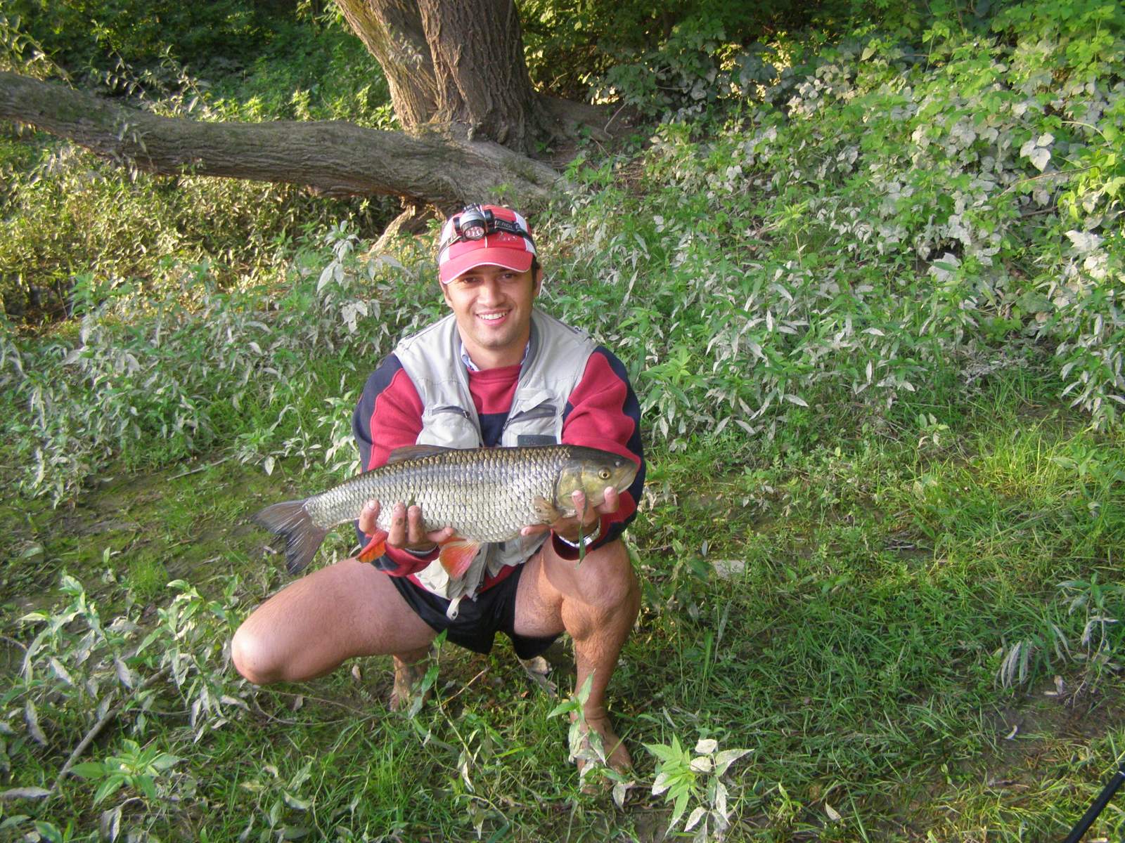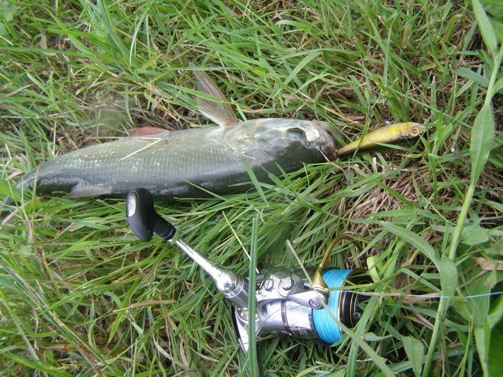 Получилось у меня еще раз вырваться на мою любимую речку на 4 дня:).Вода уже спала немного, но еще не стала в свое русло.Жерех как обычно присутствовал во многих местах хотя и не с такой интенсивностью как в первых числах.Было решено упираться в него.На первом разведывательном месте были единичные выходы шереспера не малых размеров, но увы отзываться на искусственные приманки он отказался.Зато я соблазнил на воблерок голавлишку грам на 400.Потом поставил МКджиг.Поймал парочку окуней и на очередной проводке что то посерьезней село. Через несколько секунд, на мое удивление, из воды показался подлещик до пол кила. После такой поимки было решено на следующее утро приехать половить на поплавчанку. После подлеща решили ехать домой, но по пути заскочить еще на одно жереховое место.Отцу сказал ждать на берегу пока я не проверю место на наличие жереха.Делаю первые 10 забросов и вот оно, первый жерешок под кило на берегу.Кричу отцу, чтоб разматывался тоже.Пока он разматывался я еще одного поймал и потом тишина-отец зря размотался.