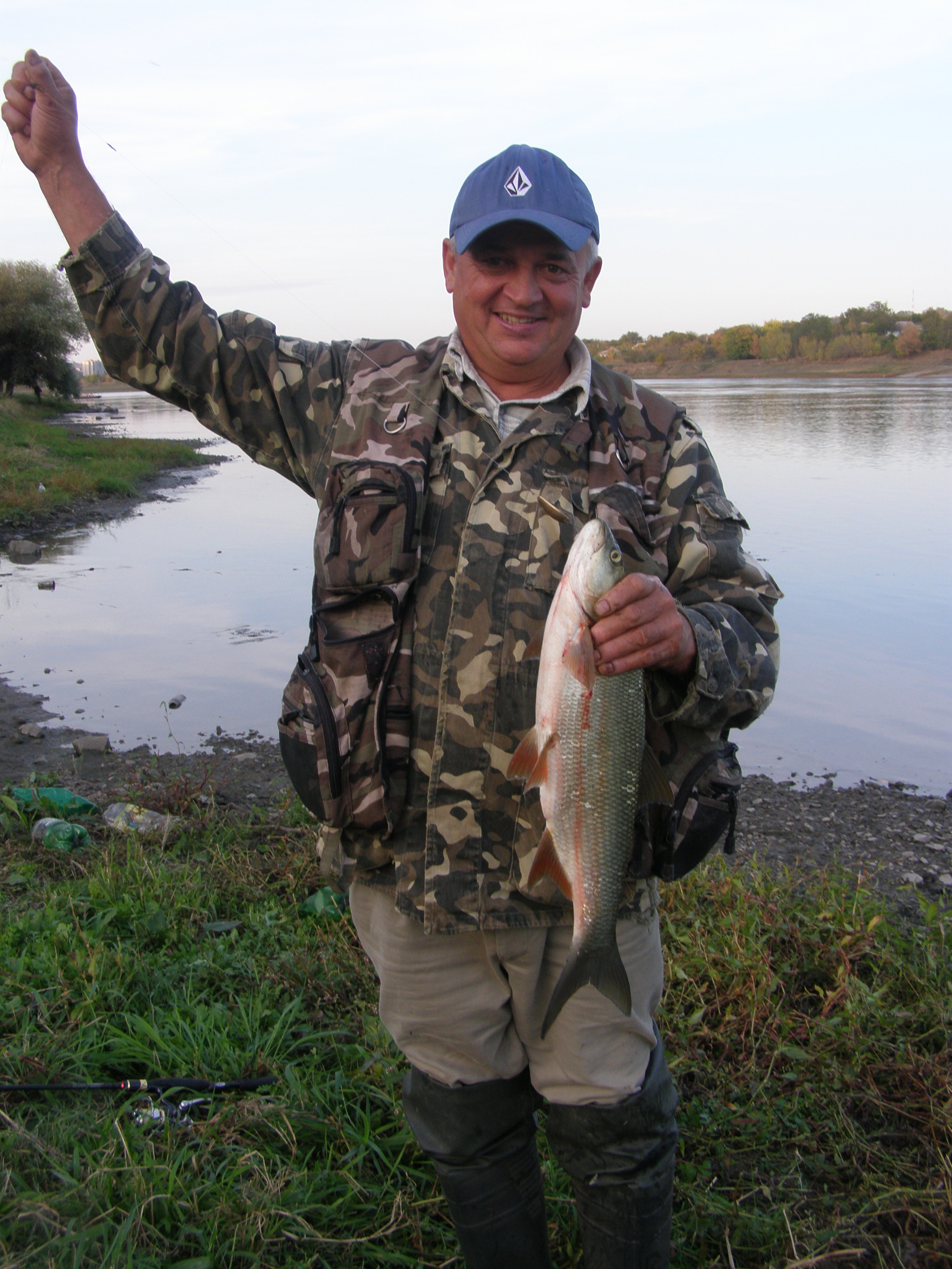 На этом мы решили закрывать утреннюю рыбалку и поехали домой перекусить и отдохнуть. Вечером часам к пяти мы опять выдвинулись по тому же маршруту. Нас все так же поджидала одна мелочевка. Ближе к вечеру Днестр начал заметно оживать на хищника. Мы с отцом бродили по соленке в надежде соблазнить кого то. Первым это сделал отец. Место в котором мы ловили совсем не предвещало такого трофея. Глубина там не больше пол метра и от такого жерешка должна была быть не плохая волна, но ее не было. И вот на очередном забросе слышу визг фрикциона и не шуточные свечи. Отец справился с ним быстро, потянул он на 1,5 кг