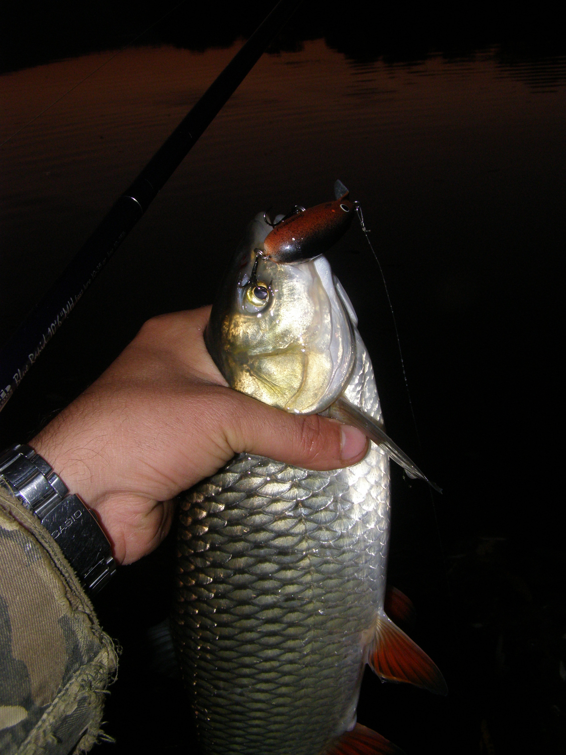 На соленке все по старому, за пол часа несколько выходов и вроде два жерешка. Короче уехал домой отдыхать и дожидаться отца, на вечер как то больше ставку делаю. Дождался опять батю, по дороге рассказываю стратегию, как и на что ловить и как вести. Все по той же схеме, я на жереха, а батя на все подряд. Жерех молчал, ни единого удара не было. Уже и отец перешел на жереха, стоим вместе и бросаем, темнеет потихоньку. И тут я слышу приятный визг фрикциона, но не у себя, а у отца! Его удивленное лицо и одно только слово-«ОГО!!!!». Секунд 15 посвистел фрикцион и сход((((, отец расстроился. Но зато уже железяку не менял, все ждал поклевки шереспера, даже ушел выше. Там где я практически всех поймал. Я же по наступлению темноты поставил мыша. Первая проводка и у самого берега четкий удар!, подсечка, есть и сход((((. Опять заброс – тишина. Еще заброс, пару оборотов и опять удар, подсечка, сход!!((((. Тяну дальше, через пару метров еще удар и опять сход –ДА ЧТО Ж ТАКОЕ!!!!!. Сосредотачиваюсь, делаю максимально дальний заброс и медленно начинаю проводку. Чувствую как мыша попом шевелит и жду когда же этот поп кого то соблазнит))). И вот долгожданный удар, да какой!!! Чувствую нешуточное сопротивление, но тройнички то овнеровские, силовые и очень хорошо впились в пасть противника. Ним оказался вот такой красавец.