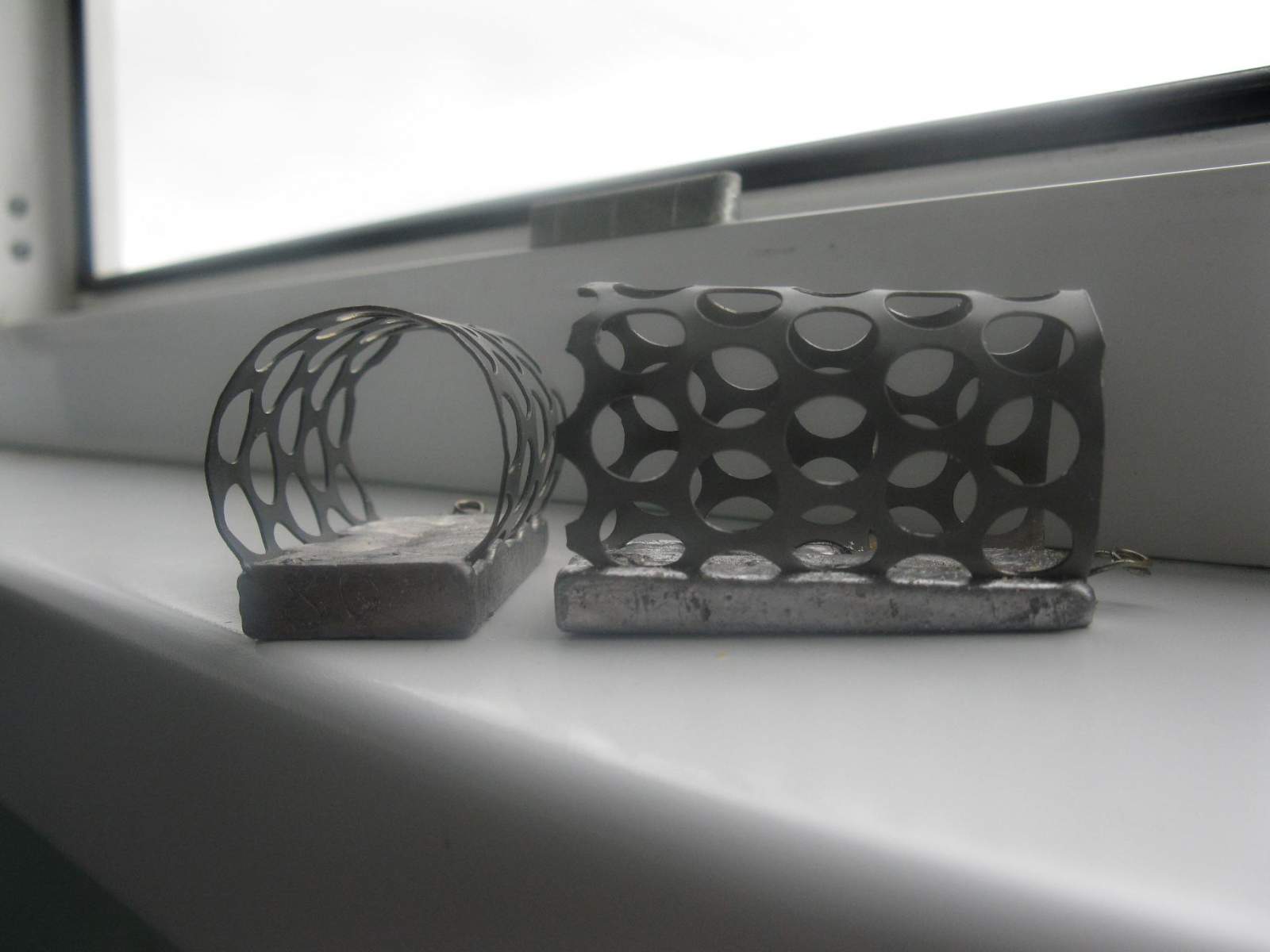 Я делаю вот такие кормушки. Особенности: центр тяжести смещен, за счет перераспределения свинца. Благодаря этому кормушка стабильно летит и при вытягивании быстро подрывается в верхние слои воды. Также хороший подъем дает плоская сетка самой кормушки. Да и площадь грузика достаточно большая относительно размера кормушки.