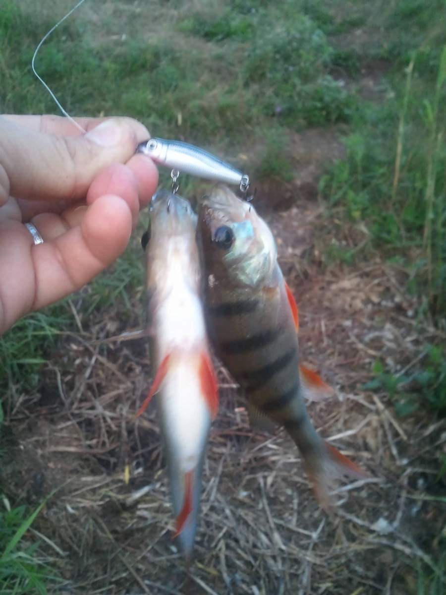 Вообщем решил сходить вечерком попить пивка на речку и взял с собой спин, проверить недавно купленные мной приманки(был в отпуске в западной и прикупил там себе 3 стика ужгородских, 2 Strike Pro Midge в расцветке G500 и А010 и Pontoon 21 Greedy Guts 55F-SR 404), оказывается там намного дешевле всё чем у нас, ну да ладно об этом позже. Итак по пути на речку сходил в магаз за топливом, прихожу на моём месте сидит мужичёк(карасятник ) живушка пустая, поболтали, пообсуждали и он через 30 мин. пошёл домой, я в тоже время не долго думая стаю на его место и ставлю проверенного иончика 35 делаю один оборот катухой ... УДАР и есть быстренько отцепляю, заброс два оборота катушкой, опять УДАР и окунёк покрупнее.После поставил "миджика" в цвете А010 и в итоге за два с половиной часа (с 18:30 до 21:00) 12 окунцов, даже один раз дуплет был(сори за качество фото руки дрожали ).Вообщем ловить рыбу можно не выезжая из Кривбасса.