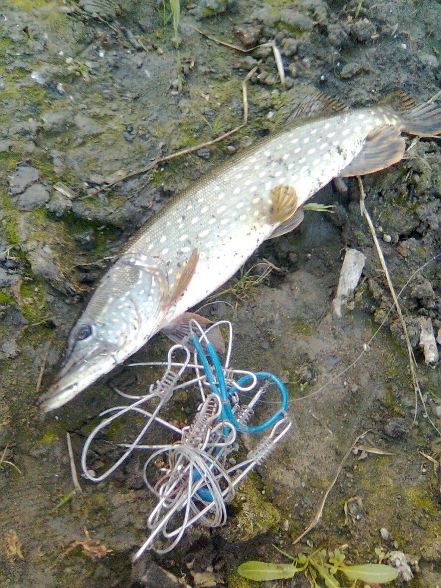 Вчера наловил порядочное количество живцов горчака и верховодки. Сегодня решил пройти по речке Ингулец в районе поселка Всебратское. Лишь в одном месте сразу после приводнения живца поплавок на удочке дальнего заброса исчез почти мгновенно. Я выждал секунд десять, и когда леска начала потихоньку натягиваться, подсек. Приличное сопротивление рыбы довольно крупной для нашей речки, пару красивых свечей. Рыбак, ловивший на противоположном берегу карасей и долго наблюдавший за моими попытками изловить "щупакабру", от неожиданности чуть не выронил удочку из рук. Непродолжительная борьба, и рыба на берегу, посажена на кукан. Больше поклевок не случилось. Кантер дома показал 1810 грамм.