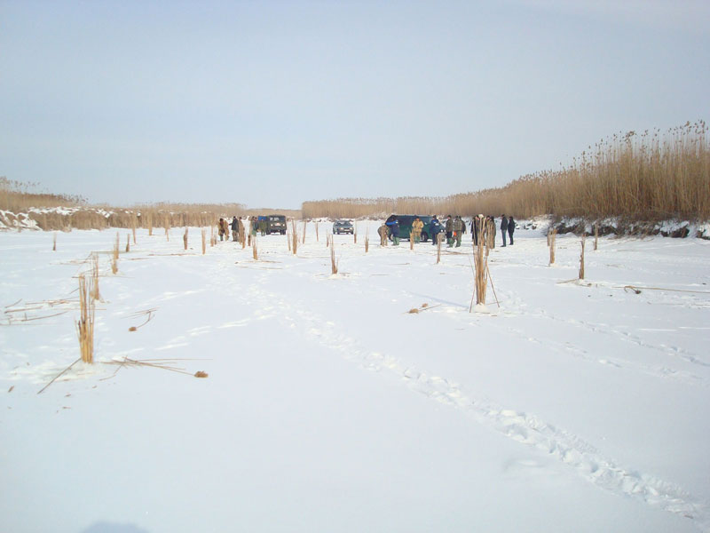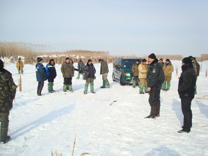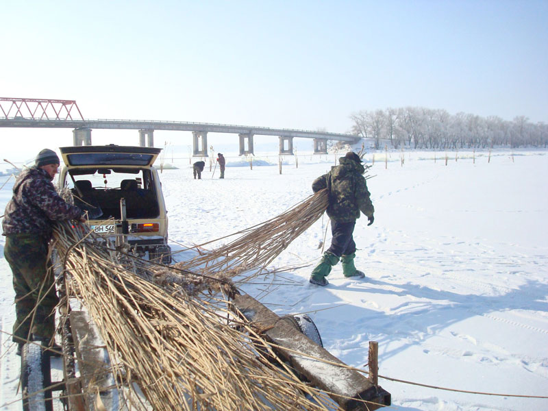 Чтобы хоть как-то помочь оставшейся в живых в этих маленьких озерцах рыбе всем рыболовным миром вышли на лед. Сверлят лунки, рубят проруби... Не говорят, а делают! На льду вставляют очерет в ополонки рука об руку и промысловики, и рыболовы любители, и сотрудники рыбоохраны, и жители прибрежных сел, которым не безразлична судьба водоемов.