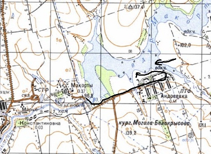 Вот карта,стрелка - залив,чёрная длинная стрелка - дорога от села. Смотри карту в конце сообщения.