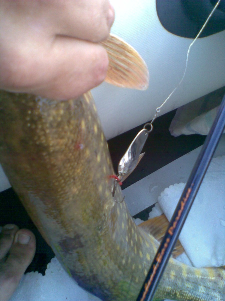 Ну, а у меня меньше была, но за то так : Сначала как зацеп, потом тяну как бревно, дальше уход плетенки в сторону дугой.... ну и понеслась. А когда увидел что просто забагрил , то прозрел . Палка отработала нечего делать, причем временами я форсировал события, так как "птичка" в любой момент легко и непринужденно могла упорхнуть. Взвесить не срослось, только вот это одно фото, на память. Ушла потом с куканом вместе ( развязался/расплелся леер за который на карабинах цеплялся кукан ). По фото видно, что 2-шка там есть. Что интересно, щука всплыла с куканом через 2 дня прямо возле того места где и была поймана . На следующей рыбалке знакомый рыболов отдал мне мой кукан.