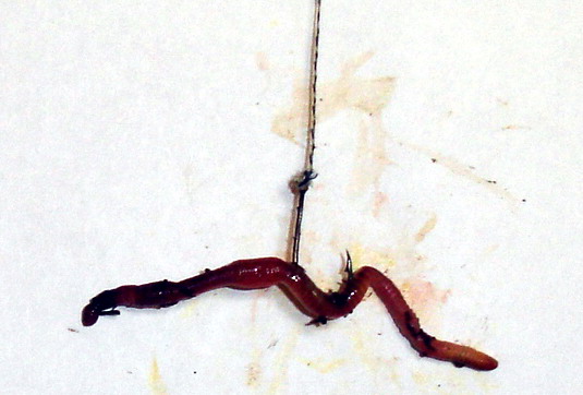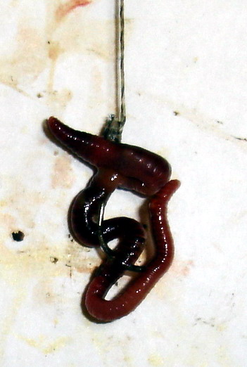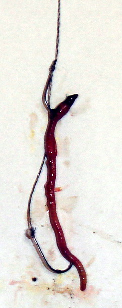 Некоторые способы насаживания червей. 1. Редкую рыбу смущает открытое жало крючка, а вот игра червяка привлекает и возбуждает ее, я одеваю червя таким образом,(см. фото 1) при этом он более живой, привлекательней и не так легко рыбе стянуть его за кончик, как если бы одели его традиционным способом. 2. Выползка лучше всего одевать(это мое мнение и из моей практики, см фото 2) на 2 крючка во весь рост, рыба лучше его видит, берет активней и меньше сходов. 3. Если вас замучила мелочь, которая постоянно стягивает червя с крючка, то оденьте его кольцами на крючок, чтобы не было концов,(см. фото 3) мелочь частично отсечется, а рыба покрупней сразу проглотит всего червя, да ей и сподручней его глотать в таком виде. А кончиков практически нет и не может мелочь его стянуь.