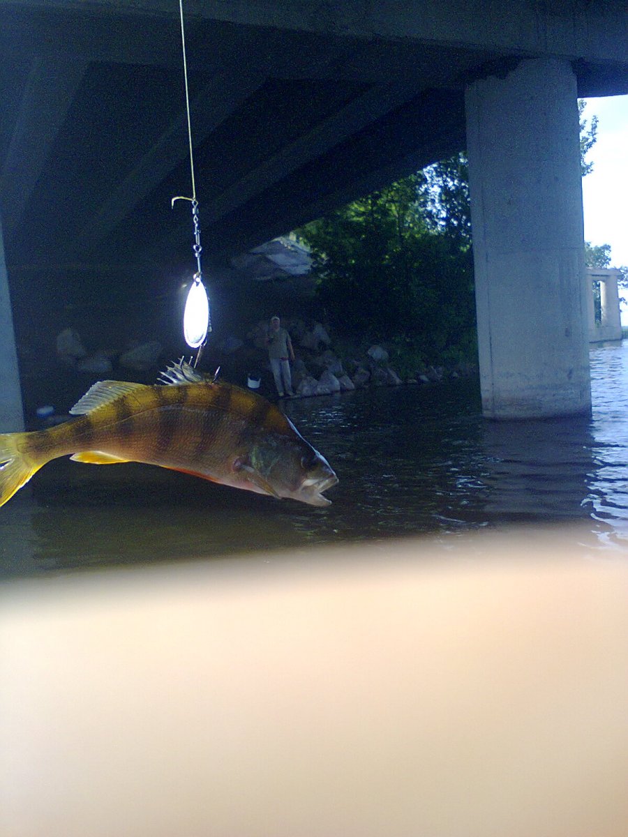 Всем привет! Наконец то вырвался в данную акваторию! с 7-00 на воде трое в вейдерсах двое с твердого берега. в течении часа полный ноль зацепил сеть под мостом ...уничтожил. с 9-30 первые тычки полосатого и пару штук таки вцепилось пока настраивал мобилку, оба плюхнулись обратно в воду:D! Потом таки один промазал но подставил хребет так и выволок! Дальше еще один полосатик и затихло, кроме ветра. Был еще один сход зубатой, но протянул не больше метра, выплюнула вертушку! Из 5-ти человек успехом увенчался один, щупачек гр 600-700 остальные немного подловили окуня. В 12-00 смотались. Фото0266.jpg
