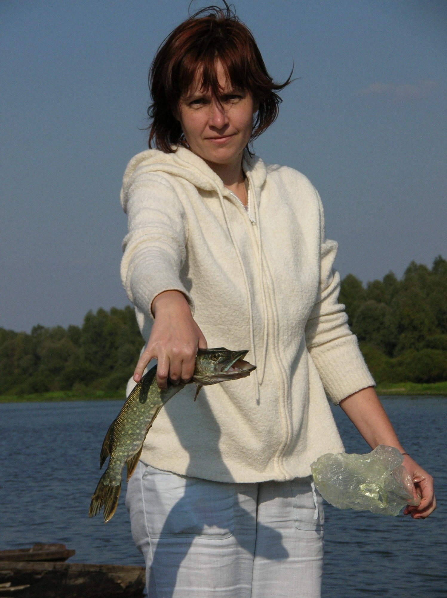 Вот еще нарыл фотки своей жены (опять же с моей щукой) А на заднем плане, обратите внимание, лодки-"довбанки". Редкость в наше время.