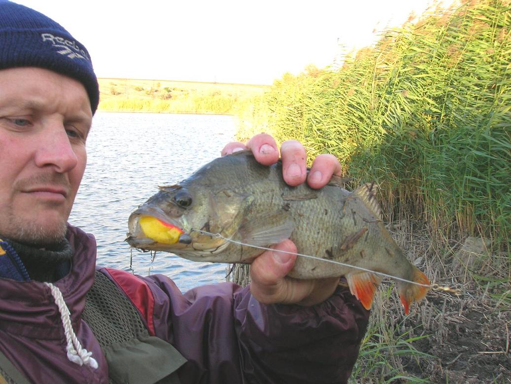 Очень уважаю ОКУНЯ. Боец. Таких больших, как вижу здесь, не ловил. Но пару лет назад(16.10.2005г.) попался крупненький, наверное до пол-кила (говорят там и до килограмма попадаются). Тогда окуня частенько полавливал. На озере, Ново-Григорьевское охотохозяйство. Удовольствия от ловли окуня - выше крыши! Ловил с берега, джиг 5гр, силикон "маннс" 5см, поводок "самопал" 0,5мм да это и так видно на фотке(потому что бывают щучки). Зацените:
