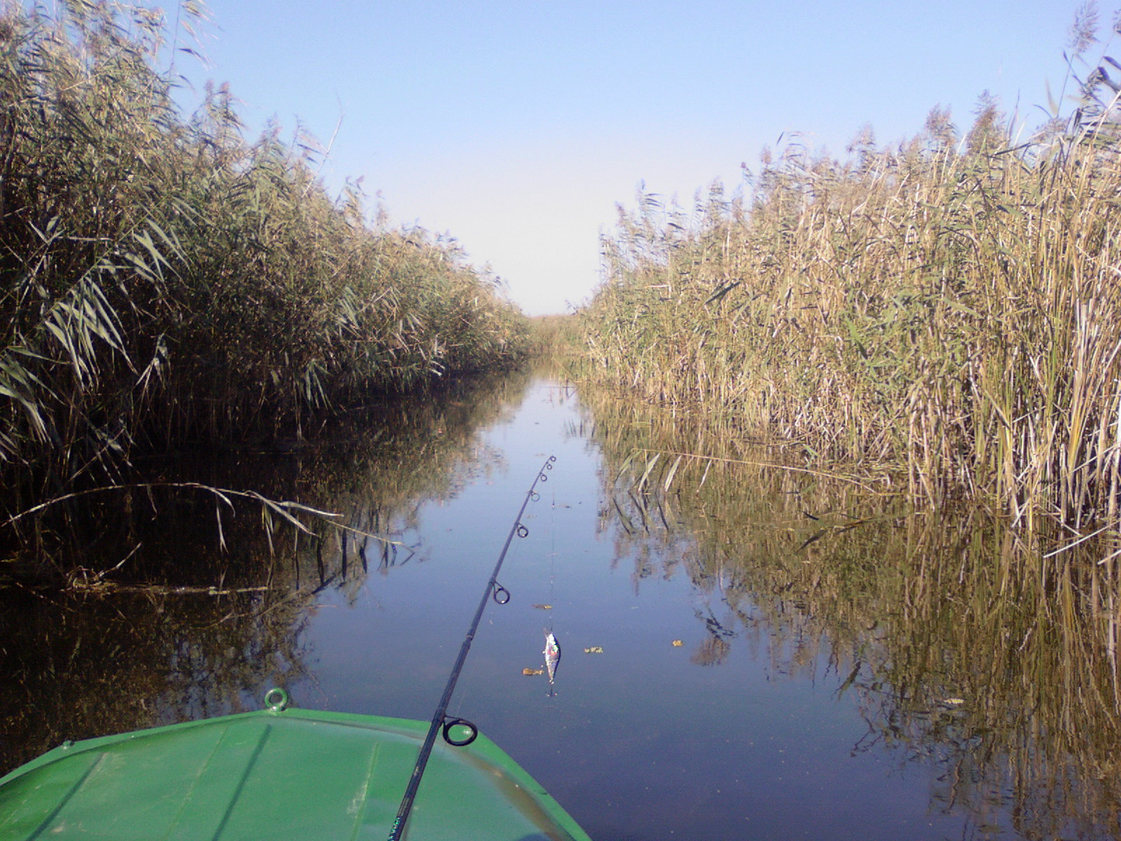 Завёл будильник на 04.00 но встал раньше (не спал всё ночь). Собрал провизию, сел в машину заехал за напарником и в путь. Дорога заняла три часа(200км), с лодкой на багажнике. На месте были в 07.30 Познакомились с человеком, разложили лодку и в путь. Товарищ облавливал левый берег, а мы перешли ниже по течению и потом на правый. Водоём довольно интересный. Берега все обросли камышом (как на Кизомысе), глубина под камышом сразу 2 метра и спад до 5 метров. Всё дно поросшее травой. Пагода была шикарной, солнце светит, ветра нет, только лови рыбу. Все мои старания по поимке щуки сводились к неудачам и зацепам. Перепробовал весь свой арсенал, вертушки, воблеры, колебалки, (разных производителей). У напарника одна поклёвка на «Джексон карась» щучка примерно 600гр, а у меня ноль.