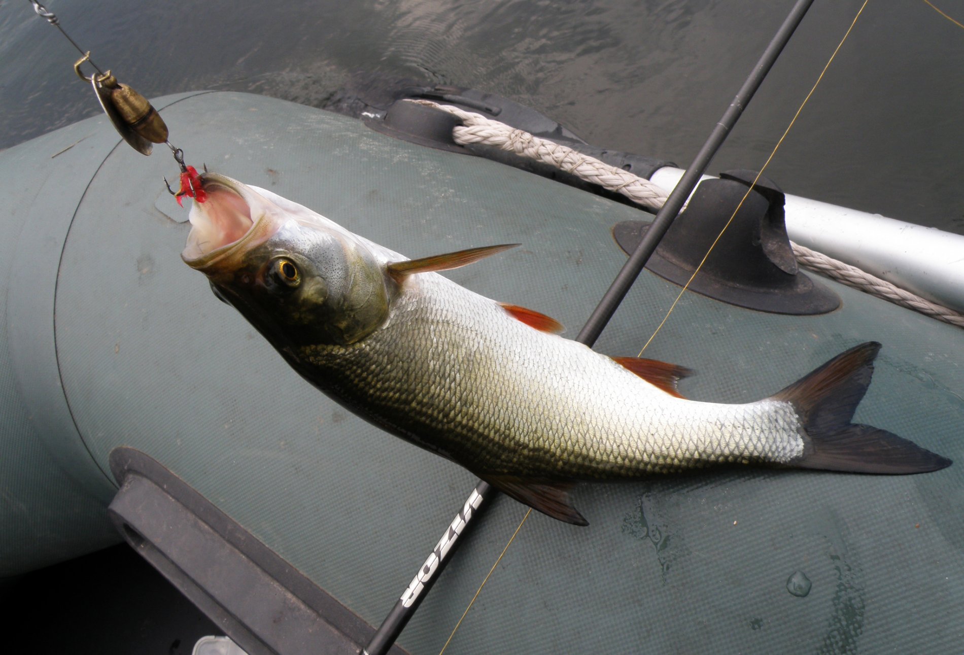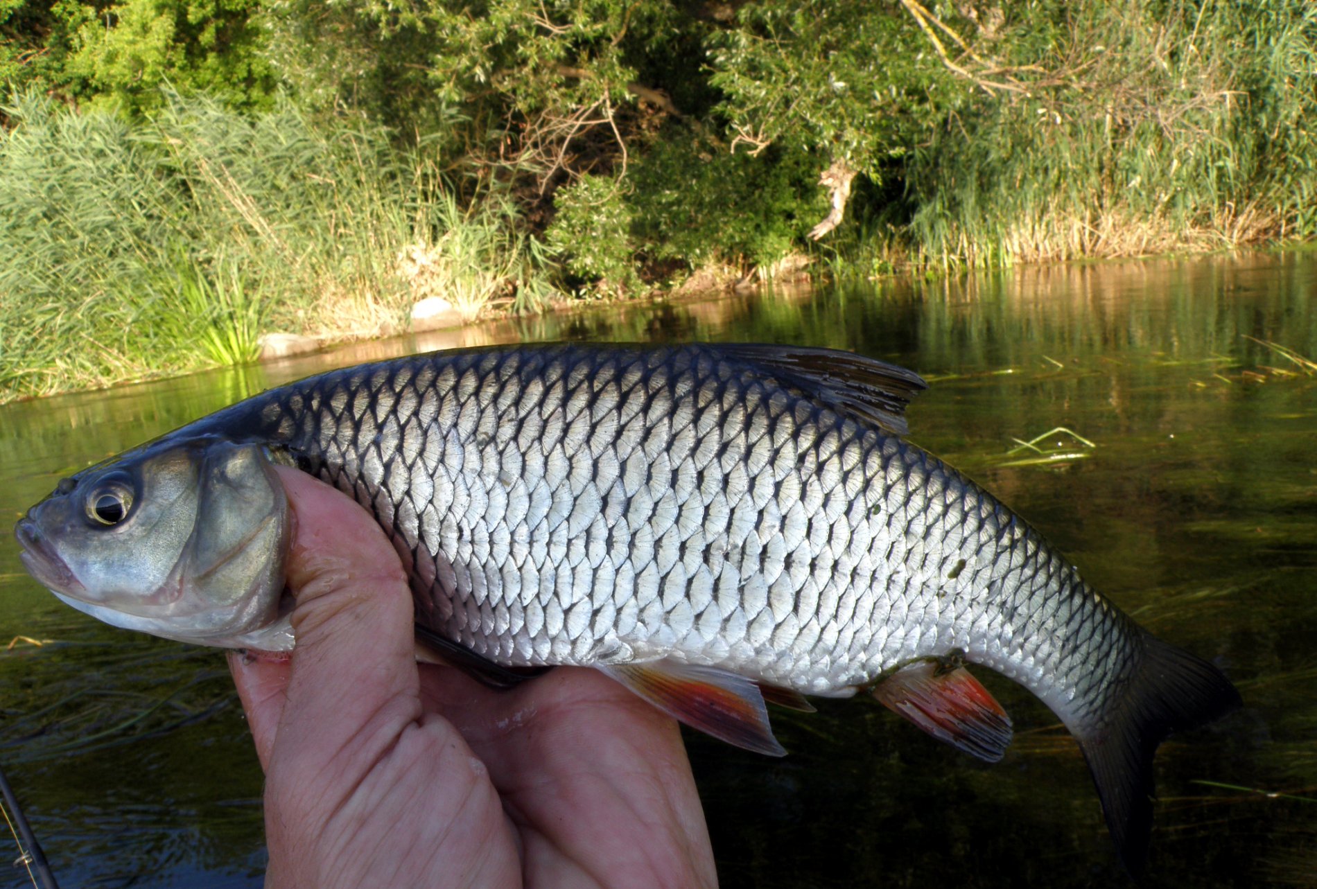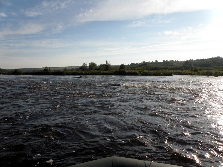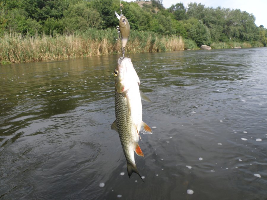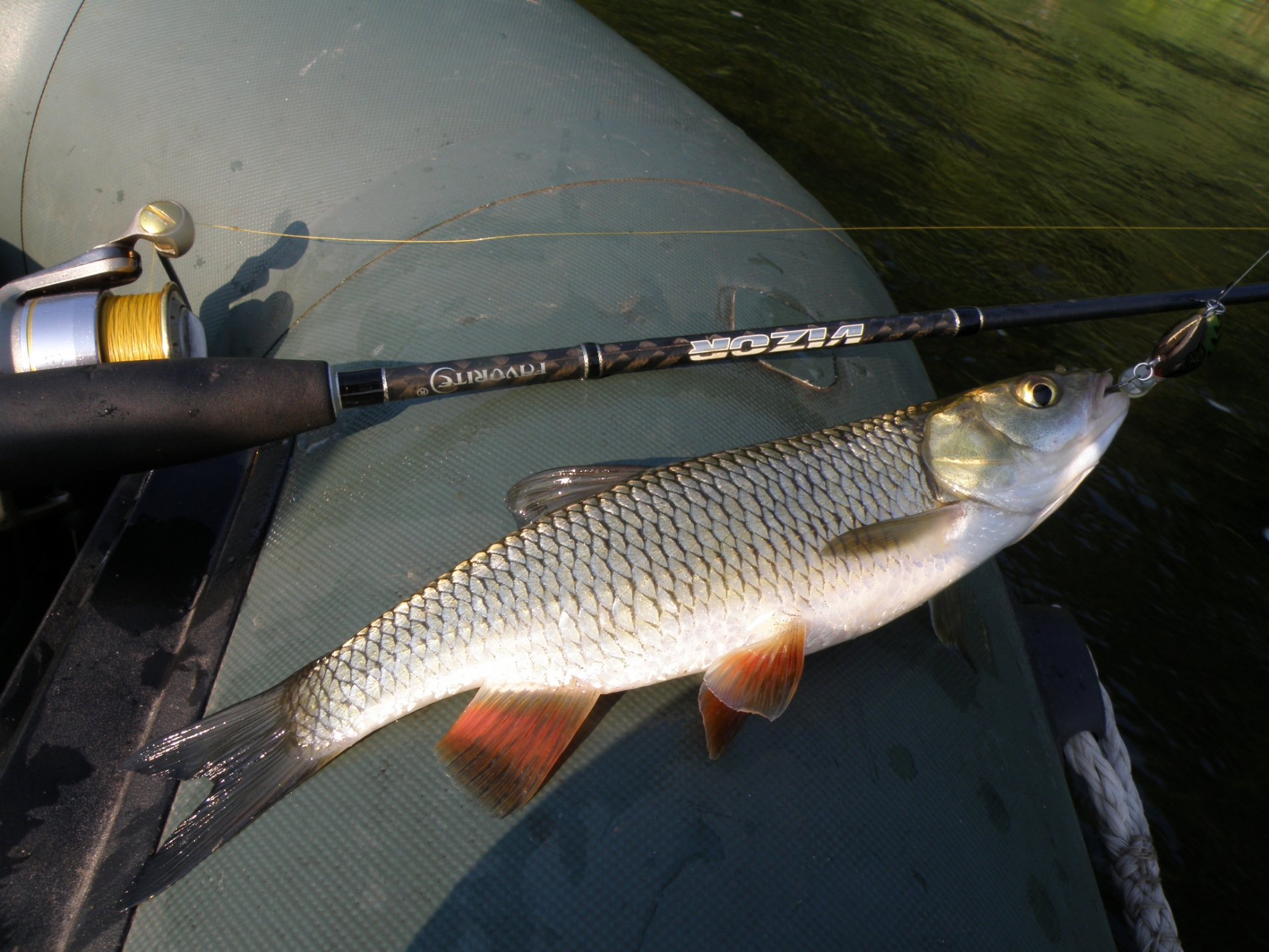 На второй день в 5.00 первый заброс. Окунь отозвался практически зразу, но не было ни жереха ни голавля. Решаю спуститься в конец переката. Заметив перспективное место стаю на якорь. Заброс под крону нависших веток дерева и как током на падении, подсечка и первый красавец голавль в руках. На этом якоре у меня было 14 (четырнадцать) поклевок голавля, 9 реализованных. Рыба в пределах 500 грамм, достойные соперники. Затем все естественно затихло. Спускаюсь практически под конец переката, и снова голавлиные поклевки не заставили себя ждать. проскакивал приличного размера окунь, а вот жереха нет. Прорыбачив так до 11 часов, гребу как бурлак с лодкой через перекат к его началу там где вчера был жерех. Первый заброс, второй и удар. Но это вновь голавь, затем снова и снова голавль, жерех попался на второй день только один. Практически все поклевки из разряда отдай спиннинг!