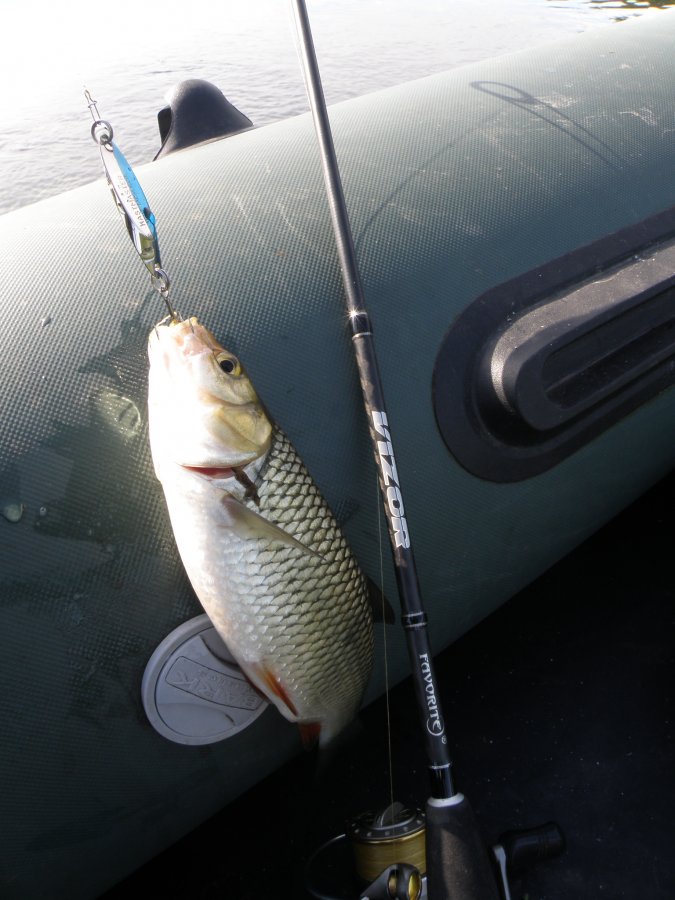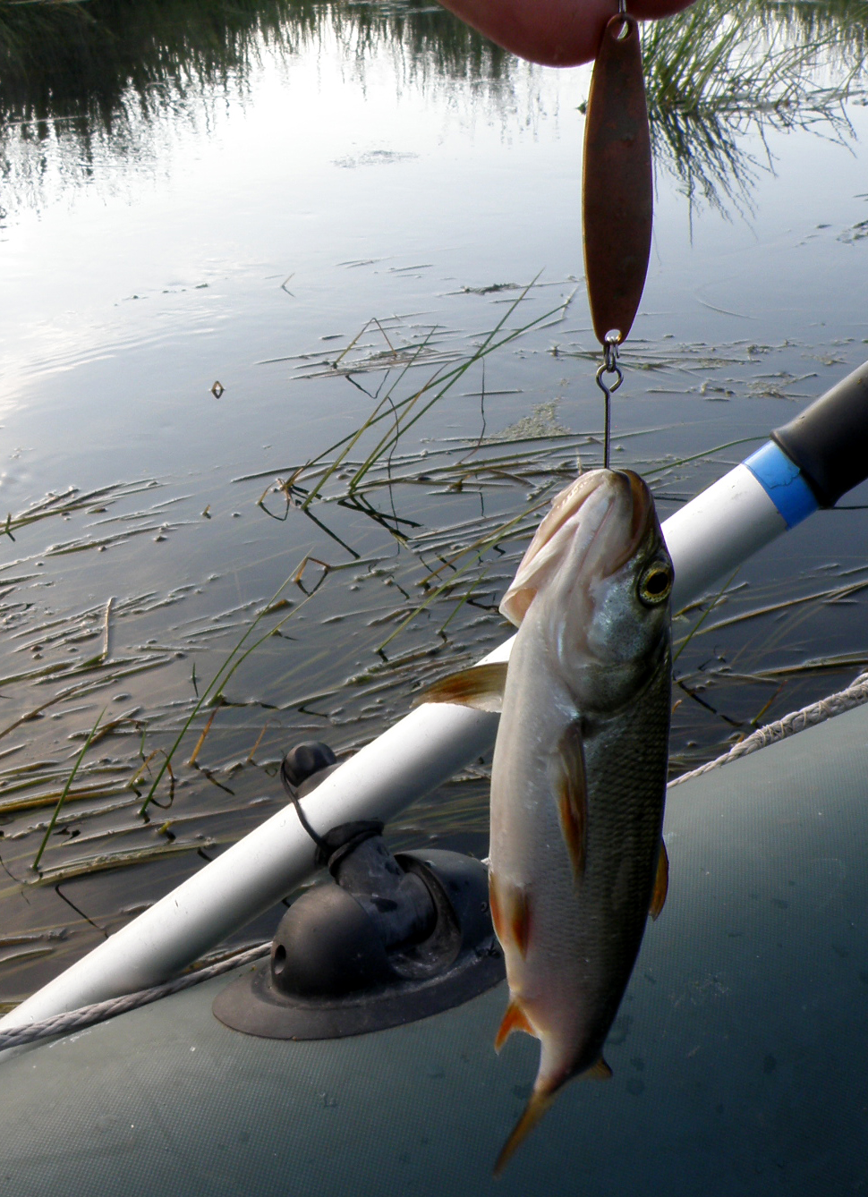 Насытившись первыми поклевками, немного смещаюсь в сторону. На очередном забросе удар на падении и красавчик жерешок в лодке, жерех не большой (около 500-700 г) но удовольствие доставлял огромное. Клевал он азартно, но пара-тройка поклевок и приманку надо было менять, видать он привыкал. Замена приманки и снова удары и сильнейшее сопротивление при вываживании. За четыре вечерние часа рыбалки десятка четыре рыбин я в руках наверное держал (вся рыба была отпущена), а ударов и сходов было миллион:) А где же голавль? Не было ни одного.
