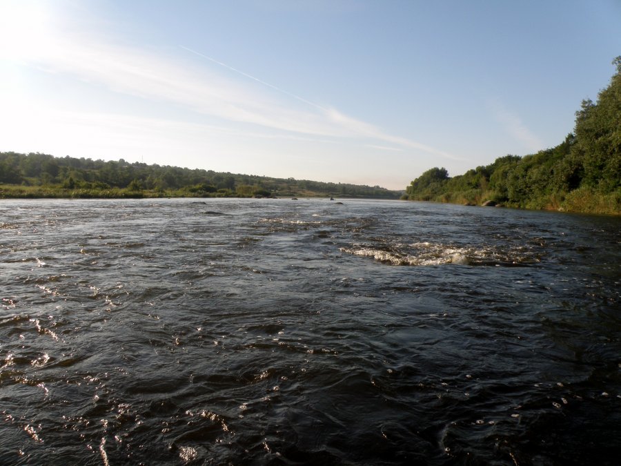 Утро на берегу встретило нас отличной погодой, легким туманом и замечательным настроением. На сегодняшний день, мы оставили самое сладкое – рыбалку на перекате и за перекатом. Пять минут хода и вот бурные воды красавца Буга подхватив наши лодки как пушинку закрутили ее в своем вечном танце. Не доходя метров 50 до окончания перекатов якоримся, я ставлю проверенную SHIKIMA и на первом же забросе поклевка жереха – красота! В течении 1,5 часов было поймано около 2-х десятков голавликов и жерешат, на очередной проводке последовал мощнейший удар и после продолжительной борьбы красавец окунь в руках. Забывается все – остается только азарт, заброс – поклевка- отпускание рыбы и все повторяется снова. Спускаемся ниже переката, можно поджиговать. К сожалению на джиг ловился только мелкий окунь. Снова в ход идут воблера и вертушки, на кастмастер клюет голавль и жерех. Ближе к обеду клев стал утихать и мы решаем вернуться в лагерь. Лодки приходится тянуть как бурлакам, спешившись по пояс в воде переходим перекаты попутно любуясь замечательной природой и кристально чистой водой.