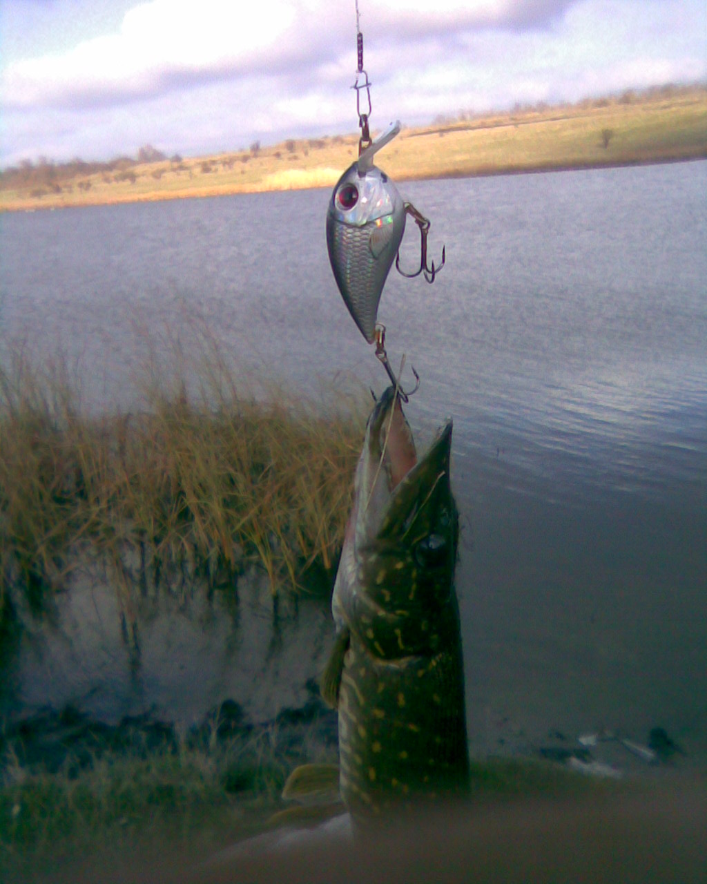 После обеда заключительный аккорд рыбалки, хоть какой был соблазн снова спуститься за перекаты, но все же пришлось из-за времени остановиться в начале переката. Рыбка молчала, вертушки и воблера ее не интересовали совсем. На очередном забросе у меня последовал глухой удар, такое впечатление, что меня зацепила подводная лодка, фрикцион начал отдавать шнур с неимоверной быстротой, ускорения придавало и большое течение реки, но мне все же удалось остановить это что-то, и вот минут через пять борьбы какого же было мое удивление когда я увидел щуку, рыбына была на вид более двух кг, а с ее пасти торчал воблерок Салмо Хорнет 2,5 см с одним тройничком и на этом тройничке зацепившись лишь за один крючок сидел крокодил. Возле самой лодки щука делает свечу и всеравно мне удалось ее утихомирить, но все же на очередном подводе к лодке рыбина сделав наверное последе усилие избавилась от воблера и махнув на прощание мне хвостом скрылась в родной стихии. Такой борьбы с рыбой у меня не было за всю мою рыбацкую жизнь, спасибо тебе Щука!
