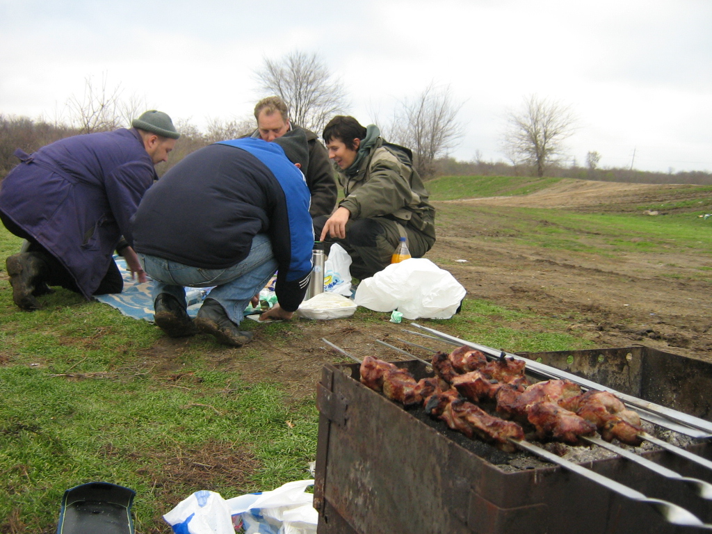 Завтрак был царским!Его главным блюдом был шашлык!После того как он зашел "на ура", все приступили к остальным блюдам.Весело пожевывая оливье и запивая его хто-чем, никто и не заметил как подъехало еще две машины с рыбаками.Как оказалось, ето был Палыч с компанией.Четыре джедая и падаван Валентин поприветствовали братьев по пристрастию и вручили Палычу, обещанное наконуне, пиво.Он поведал что были за плотиной на сливе, ловили с лодок, но безрезультатно.После недолгих разговоров и короткой фотоссесии Палыч с командой вышли на воду а джедаи взялись собирать, оставшуюся после завтрака, еду.Было высказано мнение, что еды взяли слишком много и половину прийдется везти обратно.Если бы занли они дальнейшее розвитие событий!...