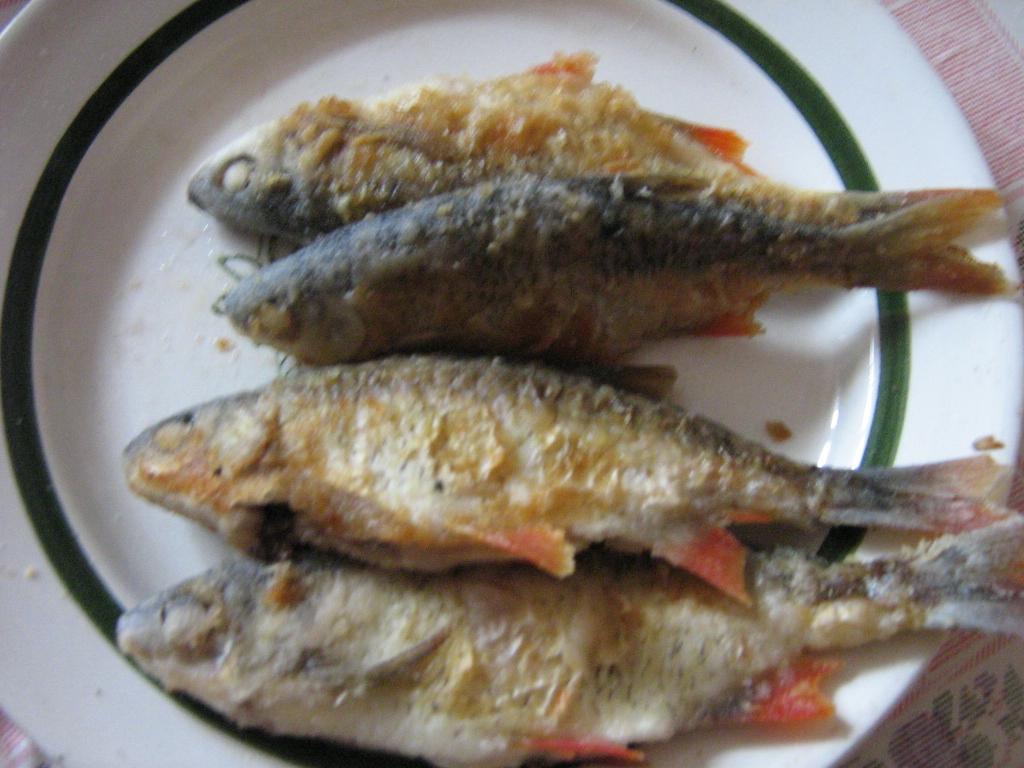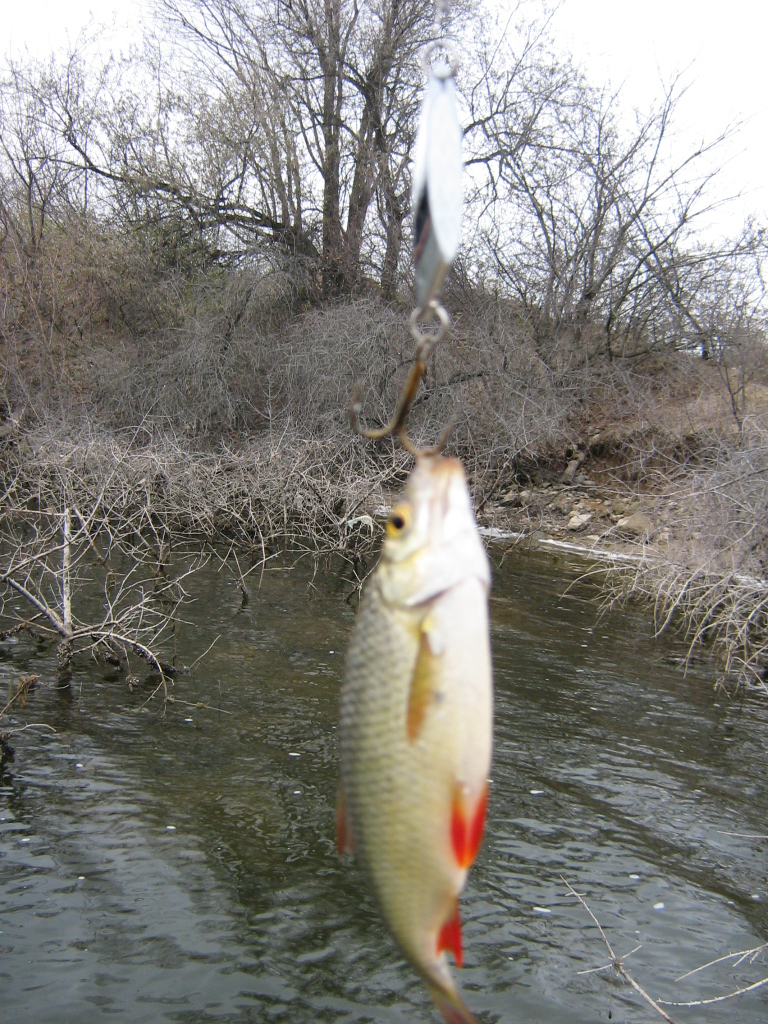 После сытного обеда и нескольких тостов "За рыбалку", все вновь ухватились за спиннинги.Время шло, а рыбы не было...Sywooch с Валентином на лодке пробовали ловить возле острова.Ленднивер и Sabat прочесывали прибрежные воды.SoffT, после недолгих скитаний вдоль берега, вернулся на то место, где утром были замечены всплески хищника.Добрая сотня забросов сделанных утром не принесли никакого результата, но надежда, что хищник еще там, все-таки была.Заброс, второй, тротий...Ничего...Часто багрится мелкая (4-5 см) плотвичка...Внезапно, после очередного заброса, на противоположном конце шнура что-то почувсвовалось."Окунек" - мелькнуло в голове, но мелькнуло как-то неуверенно - не похоже на окуня.Подняв рыбу из воды он стоял еще некоторое время тупо смотря на 15ти сантиметровую белую рыбку с красными плавниками.Поразило не сколько то, что клюнула красноперка, сколько, то что клюнула она на колебалку немного меньшую чем она сама!В течении часа таких поймалось еще 3 и только одна из них подбагрилась за хвост.Больше в тот день рыбы не было.Ни у кого.