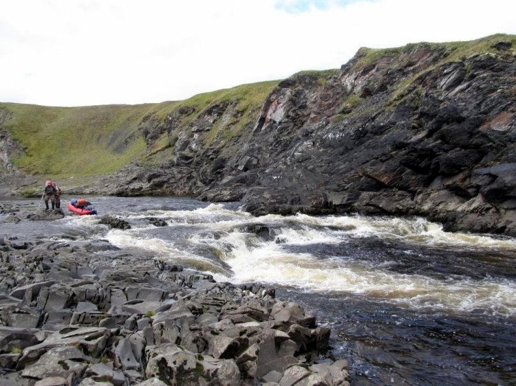 И вот мы дошли до больших водопадов.Первый трёхступенчатый водопад сразу развеял мысли о прохождении даже на бичеве,ТОКА ОБНОС! Острые штыри сланика прям в струе и мощные прижимы к острым скалам неоставляли шансов.К тому же на последней ступени вся река из мощных прижимов устремляется в узкую щель слива(пару метров буквально) с огромной силой.Такое препятствие даже мастерам пластикового каякинга не всем думаю под силу.Если там положит судно ,то пловца об камни просто размазжит и нашинкует.А мы благополучно обносим этот водопадик по правому бережку через горку.Ну а если нельзя с водопада,то хоть с горки наш экипаж лодки «Альфа-Доминанта» прокатился с удовольствием.