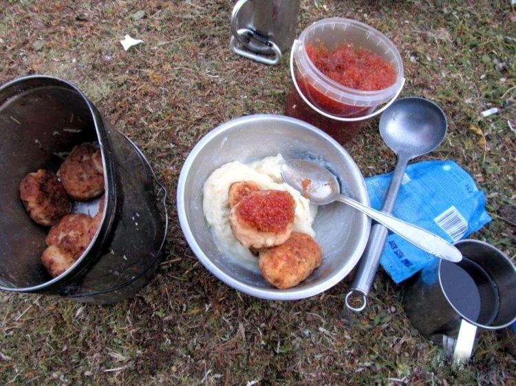 у да ладно о грусном,были и приятно-вкусные моменты на антистапеле.Якут угощал нас своими фирменными блинами с икрой.Жареная рыбка от Володи ( Лаготипа) шла тоже на ура.Ну и мы с Лёхой биточки из гольца тоже смастырили знатно.А так,как хлеба у нас не было(тока хлебцы) то икру мы просто на жареную рыбку клали иль на биточик и тоже очень недурственно получалось я вам скажу. Так же неизменно шла хорошо селёдочка в винном соусе из хоря и гольца. Ну и конечно супчик марсельский из гольца просто не мог не порадовать.