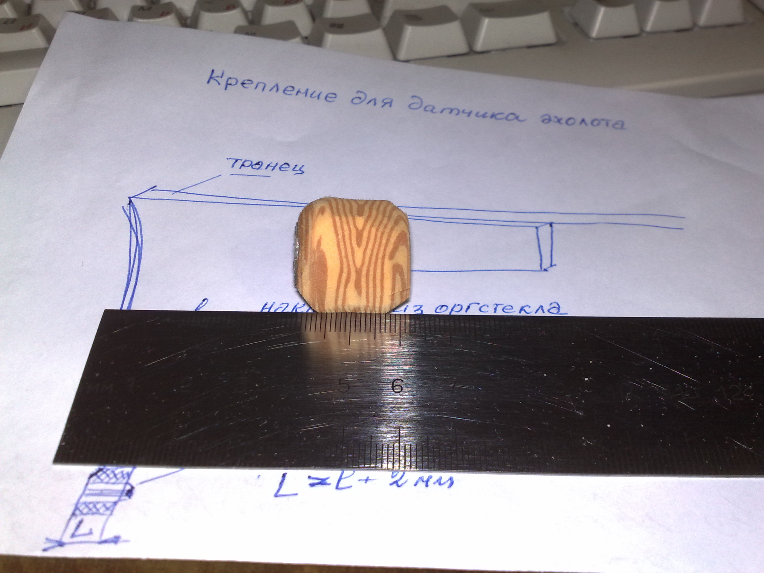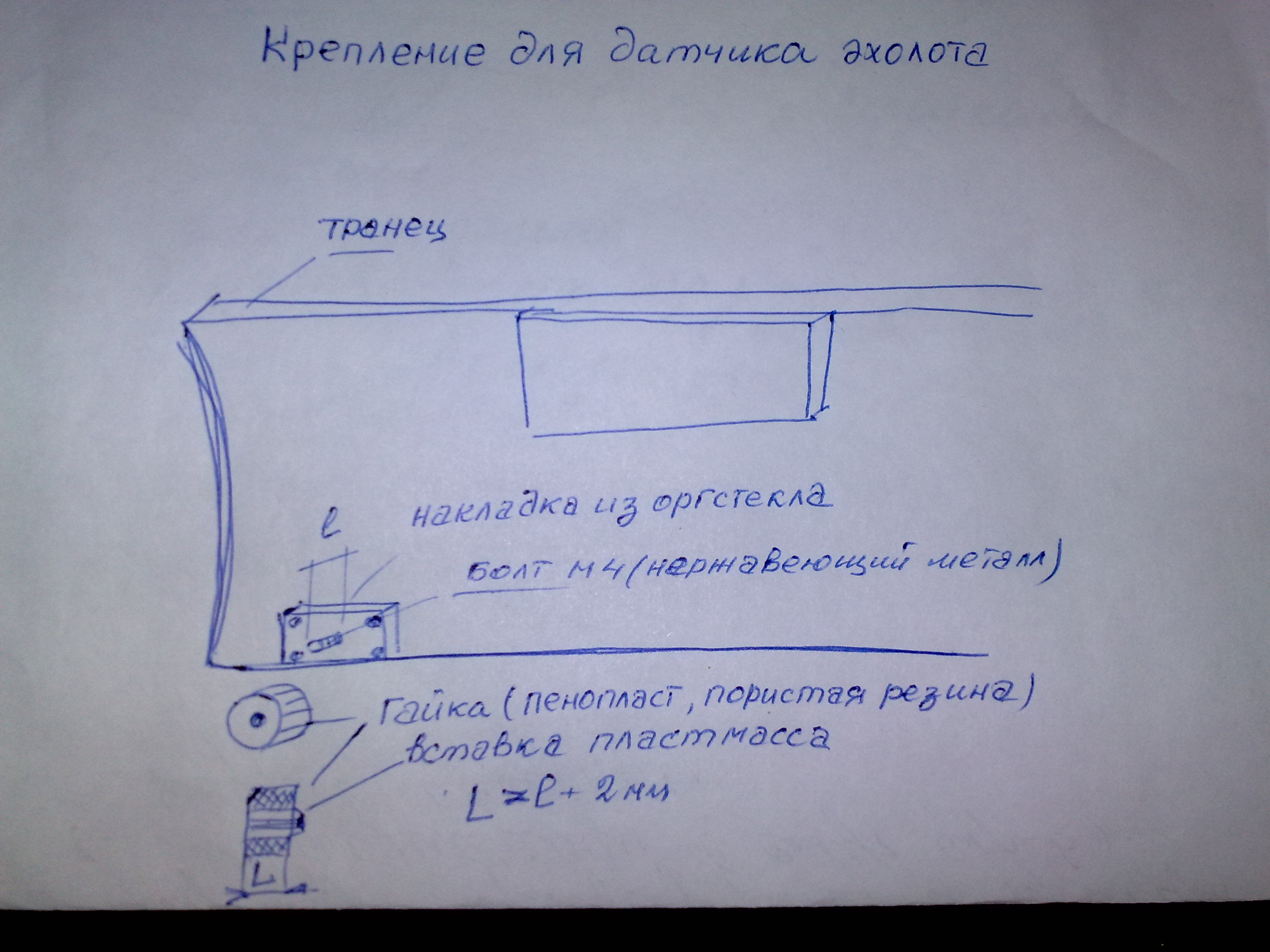 Крепление датчика эхолота Предлагаю простенькое решение вопроса крепления датчика эхолота к транцевой доске ПВХ лодки. С левой стороны (по ходу) внизу, с таким расчетом чтобы датчик находился в паспортном состоянии, на четыре оцинкованных шурупа прикручивается пластинка из органического стекла (или другого подходящего пластика) толщиной 7-8 мм. Предварительно в центре пластины делается отверстие с резьбой М4 или М5 (в зависимости от отверстия в кронштейне датчика) и рассверливается углубление по глубине головки болтика М5 (или М6), желательно под простую отвертку и выполненного из нержавеющего метала (можно нержавеющий пруток с согнутым Г-образно концом, но это несколько сложнее). На точильном станке головке болта придается максимально эллипсная форма, с большей стороной эллипса вдоль паза для отвертки. Далее в отверстие пластинки вкручивается болт - "за под лицо" и добавляется капля эпоксидной смолы. Для крепления в качестве гайки пользуюсь пенопластовой бобышкой (или из микропористой резины) с вставленной в нее пластиковой втулкой с соответствующей резьбой (втулка укреплена на супер клее). Высота гайки должна быть на 2-2,5 мм больше длины выступающей части болта, для исключения повреждения лодки при скручивании и транспортировке. Желательно со стороны накручивания сделать конусный заход для облегчения накручивания (в воде, в слепую - на ощупь – это не помешает). В приведенных фото моя запасная гайка, которая всегда находится в рыболовном ящике, из микропорки (пляжный тапочек - соответственно положительная плавучесть), втулка - из мебельной вставки для штифтов крепления полок. Мой основной вариант на протяжении 5 лет, это колесико от детской машинки с нарезанной резьбой, но в позапрошлом году имело место его утопление, ввиду отрицательной плавучести. По поводу передвижной лавки - при ходе на моторе и ловле с позиции сидя, я пользуюсь доской (шириной 18-20см), которая лежит опираясь на переднюю и заднюю лавку, вдоль лодки. Ловить на джиг как мне кажется, в большинстве случаев, удобнее сидя спиной к ветру и лицом к борту, да и брать рыбу манипулируя подсаком всеже удобнее (при ловле вдвоем она также не мешает - можно поднять к борту или положть на пол) -