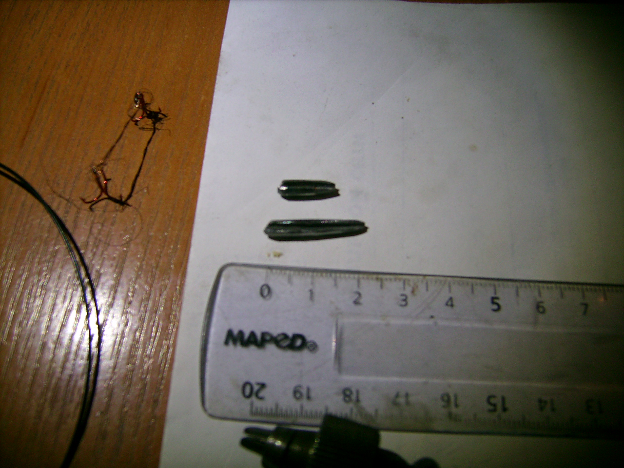 Проба пера. Напилил, обточил. По наивности начал травить ортофосфорной - естесс-но, ничего хорошего не получилось. ) На скорую руку соорудил "гальваническую ванну" из коробки из-под мороженого и старой подзарядки для мобильного. Ну, купорос там, все дела, два медных анода, посредине - заготовки. Два часа - на больше терпения не хватило... )))) Омеднились. Протравил, начал паять - галяк. Отпадает вместе с покрытием... Наверное мало держал. Или травить надо было другой кислотой. Ладно. Полез в кладовку, нашёл пробирку с азоткой (давно когда-то знакомая с ломбарда поделилась). Позвонил знакомым стекольщикам - спрашиваю, есть плавиковая (она же как оказалось, фтористоводородная!) к-та? Говорят - кАнечно! )) Сходил. Принёс, разбавил, кинул заготовки - травлю. Пузырится, стало быть, процесс идёт. Потравил минут так с надцать. Вольфрам чуть не блестит серым, остатки меди съело напрочь! )) Начал паять. Пробую ортофосфорной - отпадает. Пробую тем составом в котором травил - тоже от винта! Кароч, плюнул, сижу, нервничаю. )) Можно было бы отложить, да потом, со свежей головой... Но уже ведь загорелся! )) Начал придумывать. Ну и лучше ничего не придумал, как сделать проволочный скелет, связав им тройник с петелькой, заложить в прорезь, замотать тонкой ниткой и промазать это всё безобразие эпоксидкой! )))))) Ну и вот. Что получилось, то и получилось. ) Так, как говорится, на скорую руку. )) Буду ждать морозов для "обкатки".....