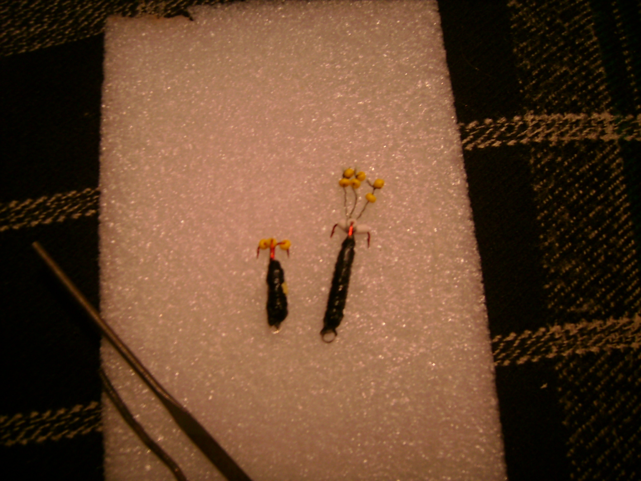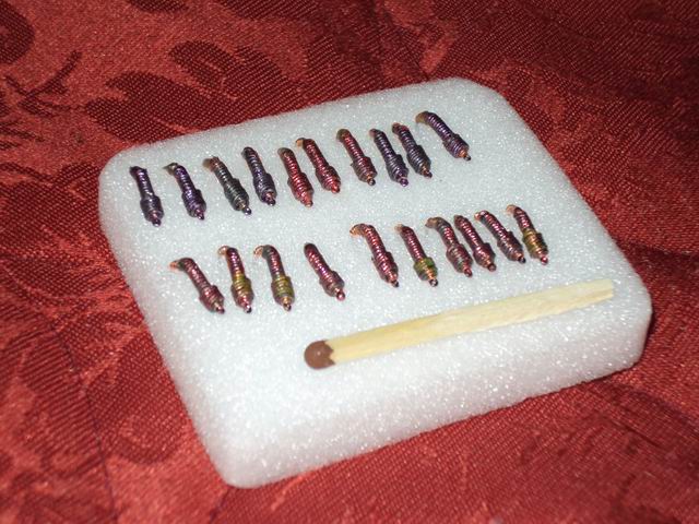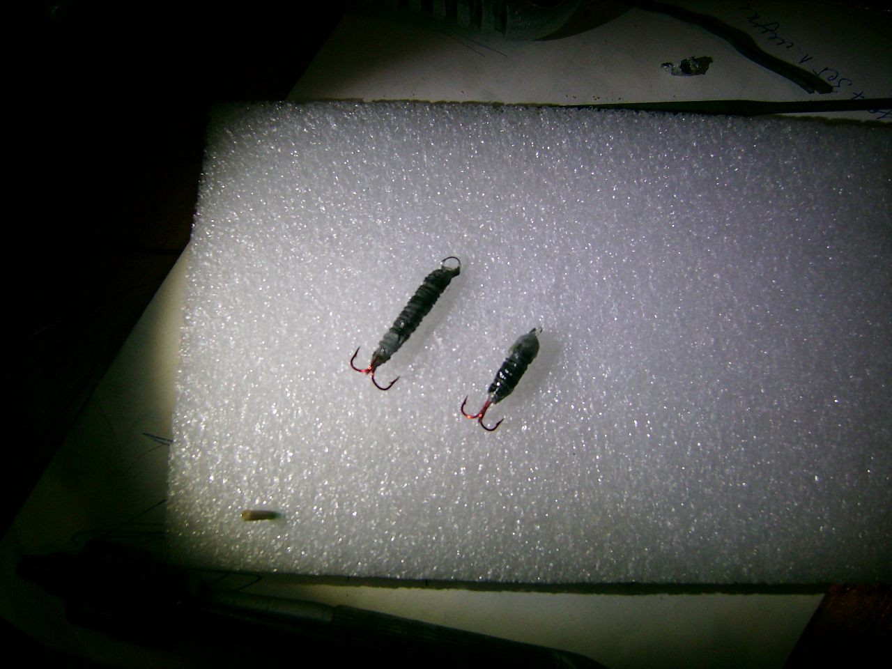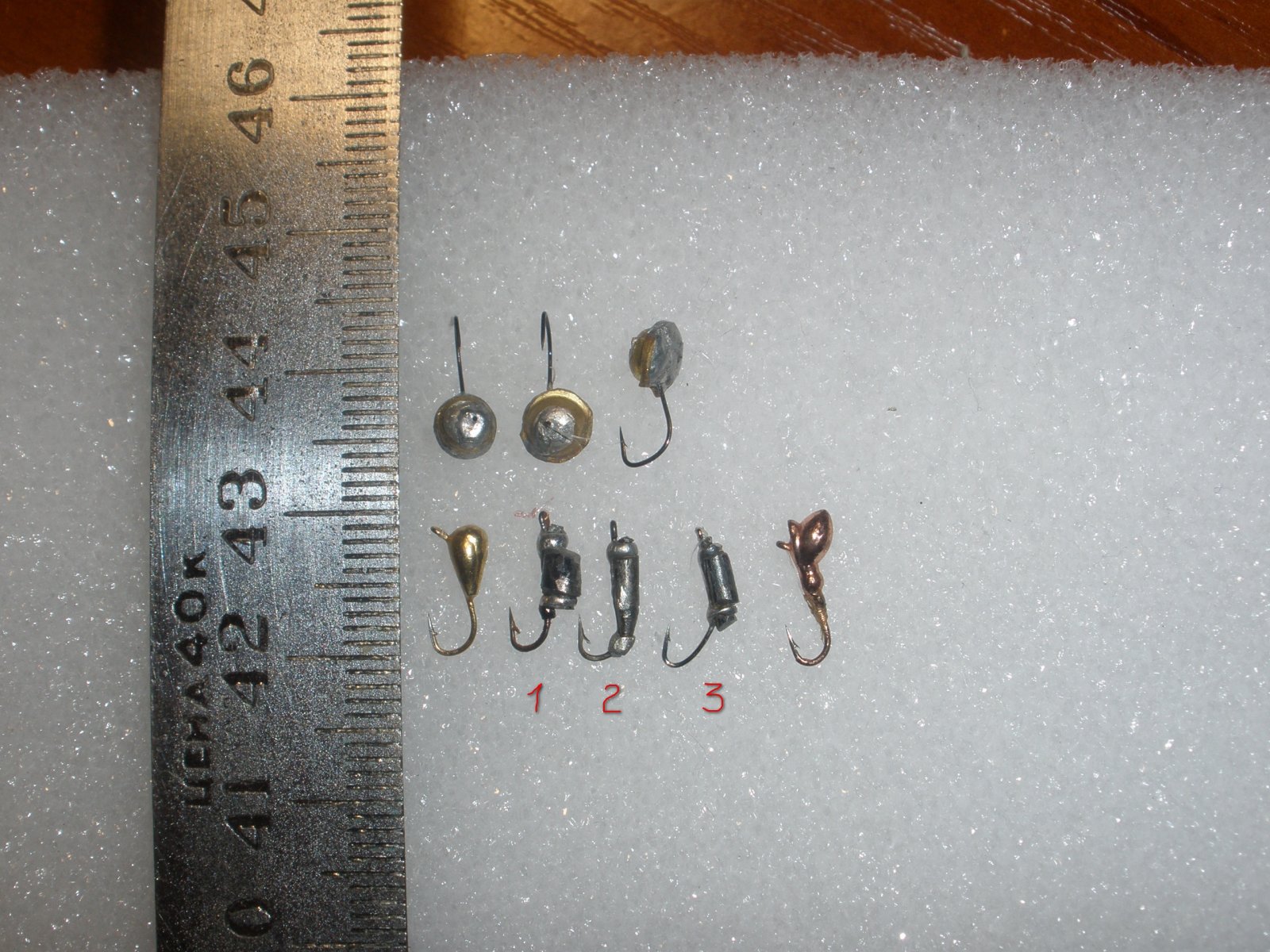 ..Похвастаюсь" своими вольфрамками, в центре три штучки, а по боках с магазина для сравнения. Вверху тоже самопал с блок-контактов (там белая напайка из серебра вот она и привлекает рыб, когда другие не работали эти ) PS:Из вольфрамового прутка, зубной алмазной фрезой вырезал заготовку, по краях (Север-Юг см.фото.) горизонтальные канавки для проволочки (медной), чтоб примотать крючек и продольная канавка (с Севера на Юг,чтоб утопить цевье крючка, дальше травленной соляной кислотой лужу, паяю и место пайки как головка или еще что-то (вольфрам темный, а место пайки светлое). Да кривая и некрасивая но пойманный рыб не жалуется.