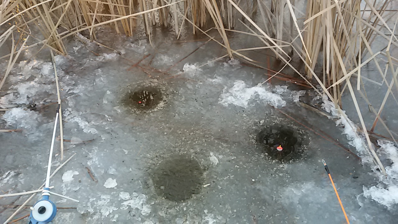 Ветер сегодня дул на славу. Просидев в одном месте без клёва пару часов , пересел на другое поймал 4 карасика, пробурил в стороне 3 лунки